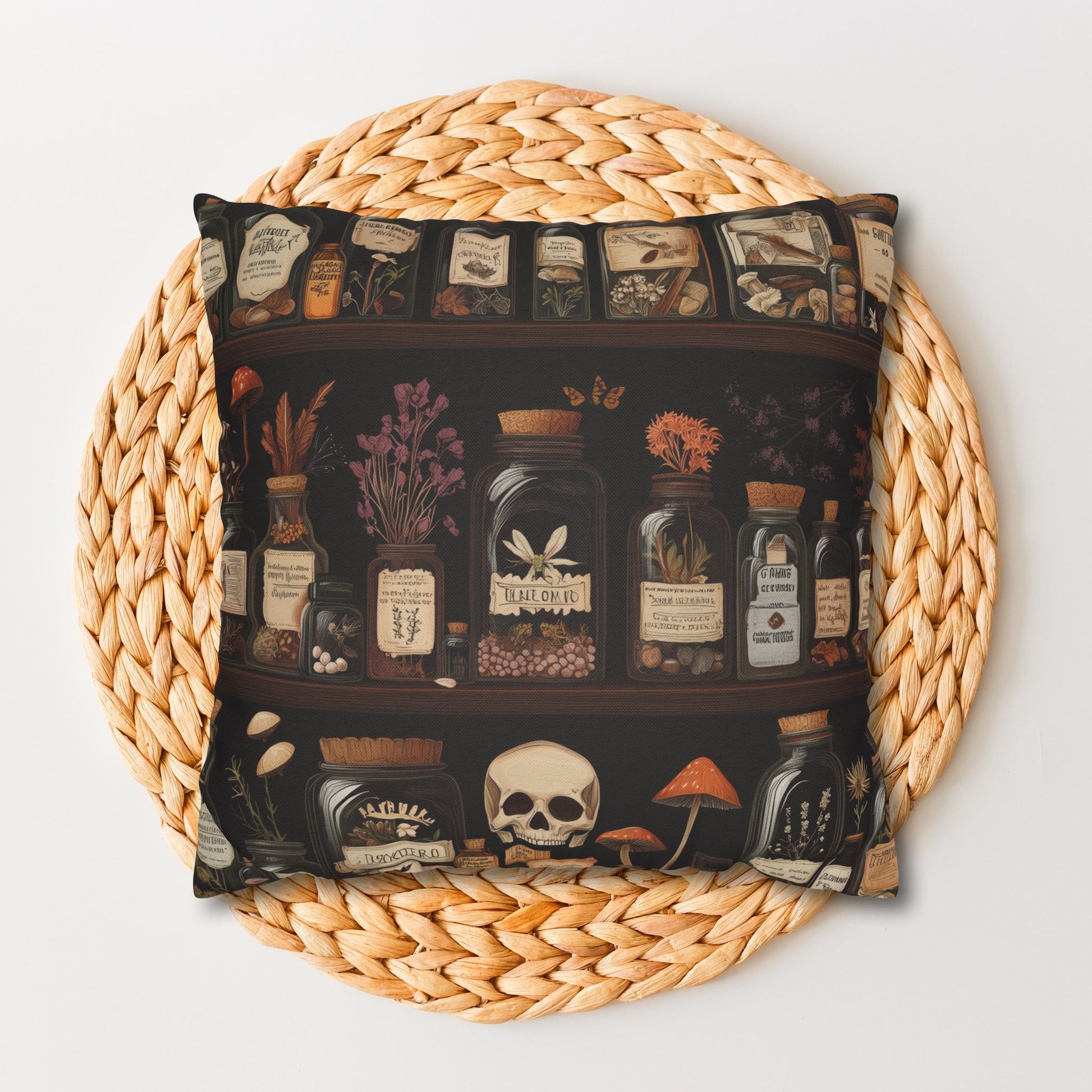 Full Detailed Etsy Product Description Add a mysterious, vintage touch to your space with this Gothic Apothecary Jars Pillow. Featuring an exquisitely detailed illustration of potion bottles, dried herbs, mushrooms, and a skull set against a dark background, this pillow is perfect for those who love witchcraft aesthetics, dark academia, or moody Halloween decor. The design captures the charm of an old apothecary shelf—each jar labeled with intricate, vintage-inspired details. Whether placed on your sofa, bed, or reading nook, it creates an enchanting and cozy atmosphere year-round. This pillow makes a fantastic gift for witches, herbalists, gothic home decor lovers, and anyone who appreciates magical and mysterious interiors. Product Features * 100% spun polyester for exceptional durability and shape retention * Double-sided vibrant print for versatile display * Hidden beige plastic zipper with sleek metal pull * Comes unassembled to reduce creasing during shipping * Optional insert made from 100% recycled polyester for plush comfort Available Options: * Polyester cover only * Polyester cover + insert * Polyester outdoor pillow (weather-resistant) Perfect for: * Halloween, Samhain, or gothic seasonal decor * Dark academia or witchcore interiors * Reading nooks, living rooms, bedrooms * Gifts for potion lovers, witches, and collectors of curiosities Care Instructions * Remove cover before cleaning * Pre-treat stains with soft cloth soaked in warm soapy water * Machine wash cover at max 40°C (104°F), normal cycle * Do not bleach or dry clean * Tumble dry low, iron or steam on low heat * Fluff insert after washing to restore shape