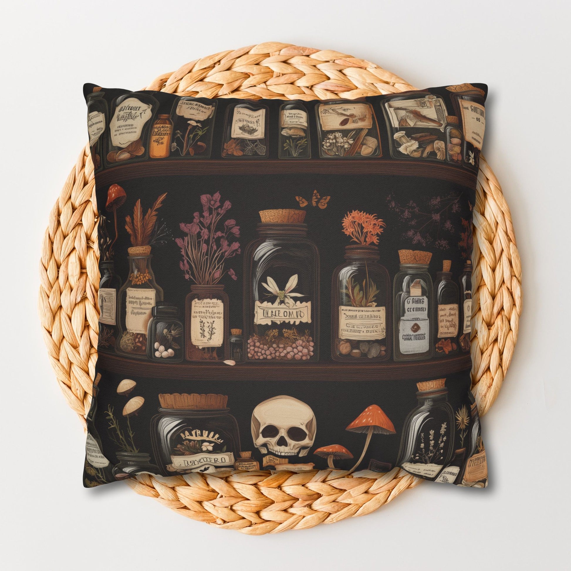 🪄 Gothic Apothecary Jars Pillow – Witchcraft Potion Shelf Dark Academia Throw Cushion, Spooky Halloween Decor