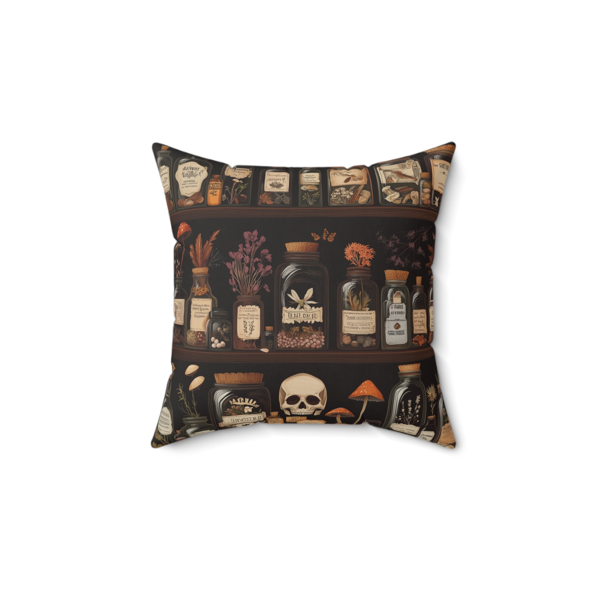 Full Detailed Etsy Product Description Add a mysterious, vintage touch to your space with this Gothic Apothecary Jars Pillow. Featuring an exquisitely detailed illustration of potion bottles, dried herbs, mushrooms, and a skull set against a dark background, this pillow is perfect for those who love witchcraft aesthetics, dark academia, or moody Halloween decor. The design captures the charm of an old apothecary shelf—each jar labeled with intricate, vintage-inspired details. Whether placed on your sofa, bed, or reading nook, it creates an enchanting and cozy atmosphere year-round. This pillow makes a fantastic gift for witches, herbalists, gothic home decor lovers, and anyone who appreciates magical and mysterious interiors. Product Features * 100% spun polyester for exceptional durability and shape retention * Double-sided vibrant print for versatile display * Hidden beige plastic zipper with sleek metal pull * Comes unassembled to reduce creasing during shipping * Optional insert made from 100% recycled polyester for plush comfort Available Options: * Polyester cover only * Polyester cover + insert * Polyester outdoor pillow (weather-resistant) Perfect for: * Halloween, Samhain, or gothic seasonal decor * Dark academia or witchcore interiors * Reading nooks, living rooms, bedrooms * Gifts for potion lovers, witches, and collectors of curiosities Care Instructions * Remove cover before cleaning * Pre-treat stains with soft cloth soaked in warm soapy water * Machine wash cover at max 40°C (104°F), normal cycle * Do not bleach or dry clean * Tumble dry low, iron or steam on low heat * Fluff insert after washing to restore shape