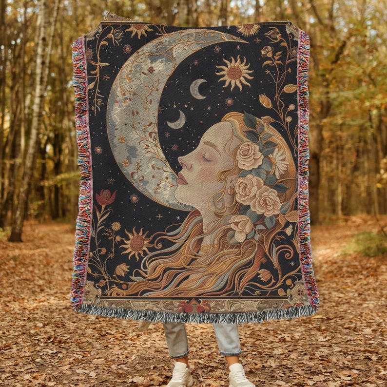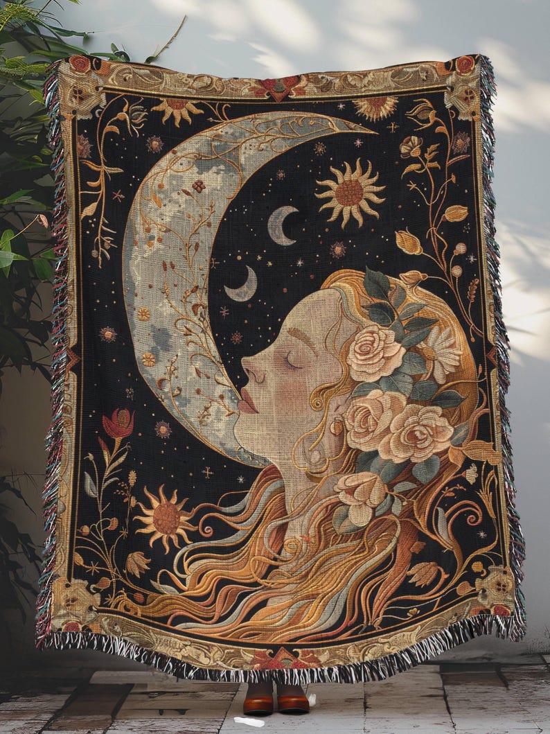 Lady And Crescent Moon In The Style Of William Morris Inspired Woven Blankets