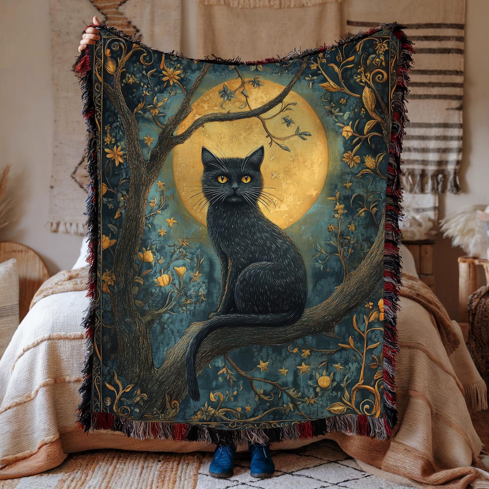 Mystic Moon Cat Woven Blanket, Black Cat Tapestry Style Throw, Celestial Night Decor