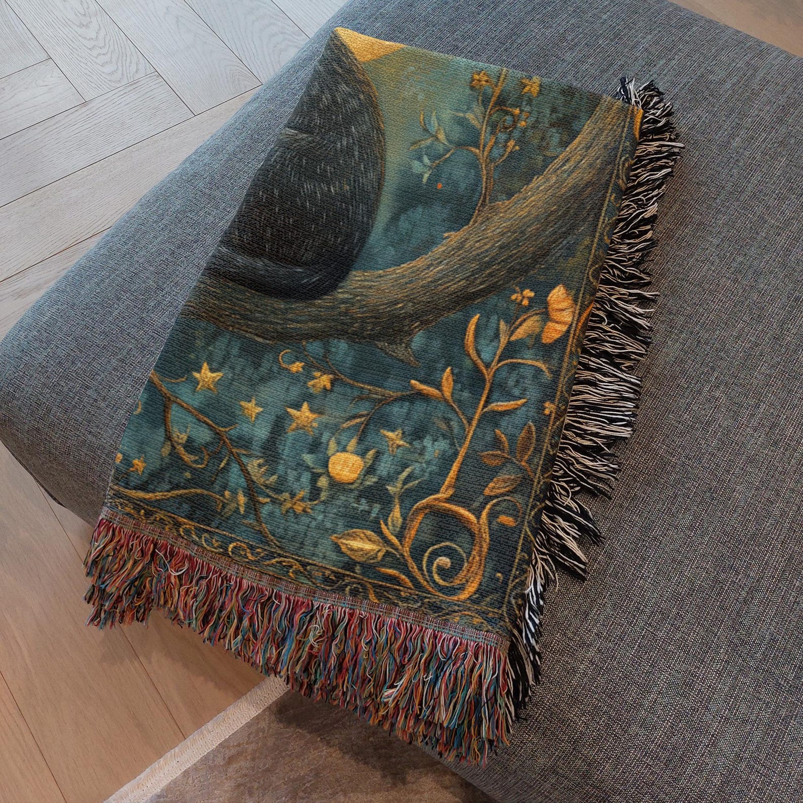 Crafted through an intricate woven process (not printed), each finished piece carries a luxurious, dimensional quality that makes the design come alive. Durable, warm, and endlessly versatile, this woven blanket adds mood and personality to any room — perfect for collectors of celestial décor, cat lovers, and fans of magical woodland aesthetics.