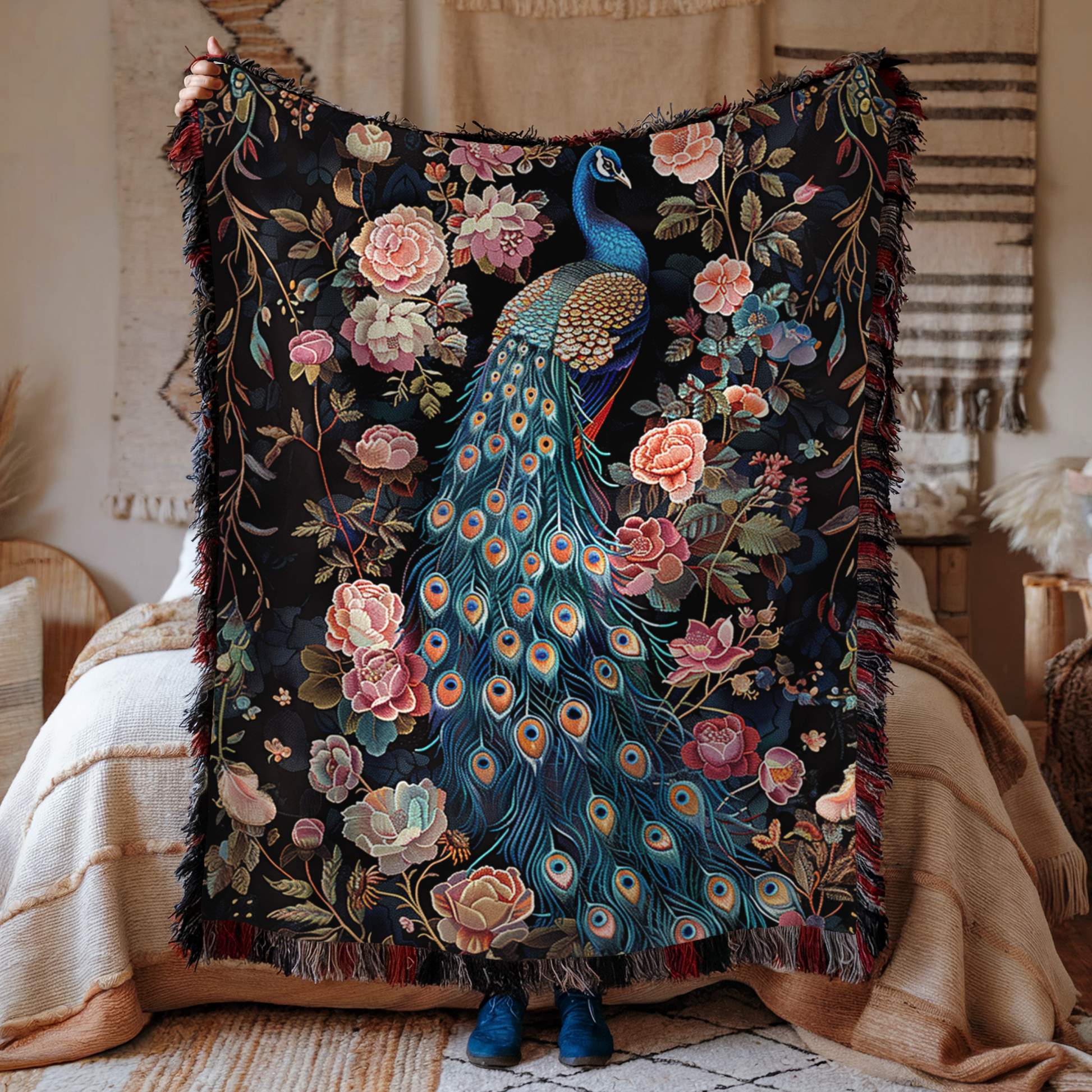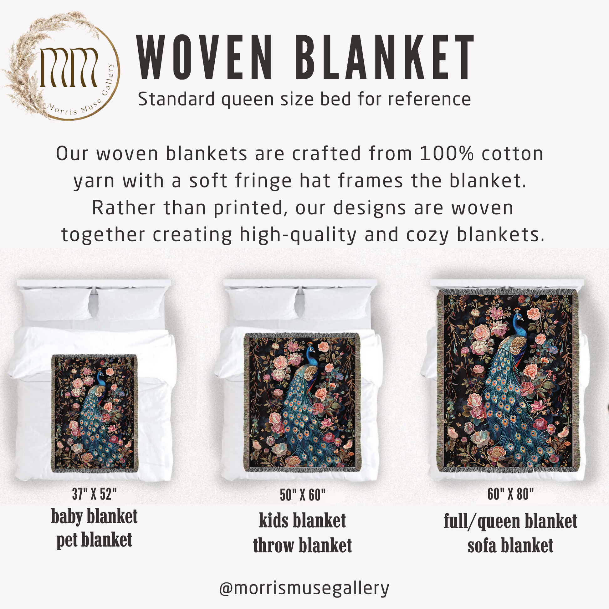 Peacock Art Deco Woven Blanket, Cozy Home Decor, William Morris Inspired Cotton Blanket