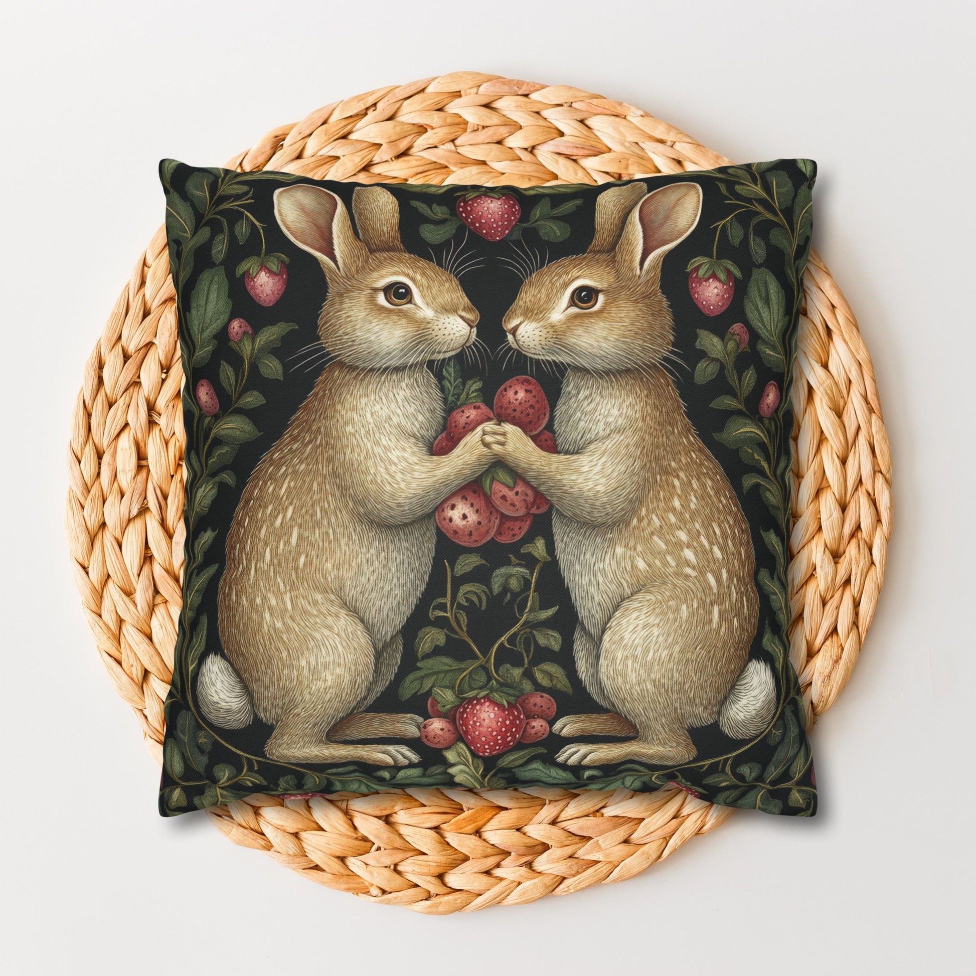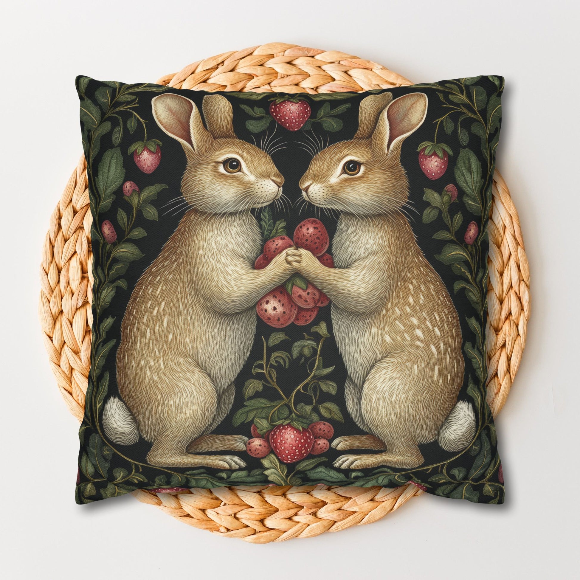 Enhance your living space with this beautifully crafted Pillow. Featuring an enchanting design of two rabbits holding strawberries, it adds a whimsical yet cozy charm to any room. Perfect for adding a pop of color and personality to your home decor, this pillow invites warmth and comfort. Ideal for animal lovers, gardeners, or anyone who appreciates unique, artistic designs. It's a perfect addition to your home for springtime celebrations, Easter festivities, or simply as a delightful everyday decor piece. Give your sofa or bed a cheerful touch with this delightful accessory!