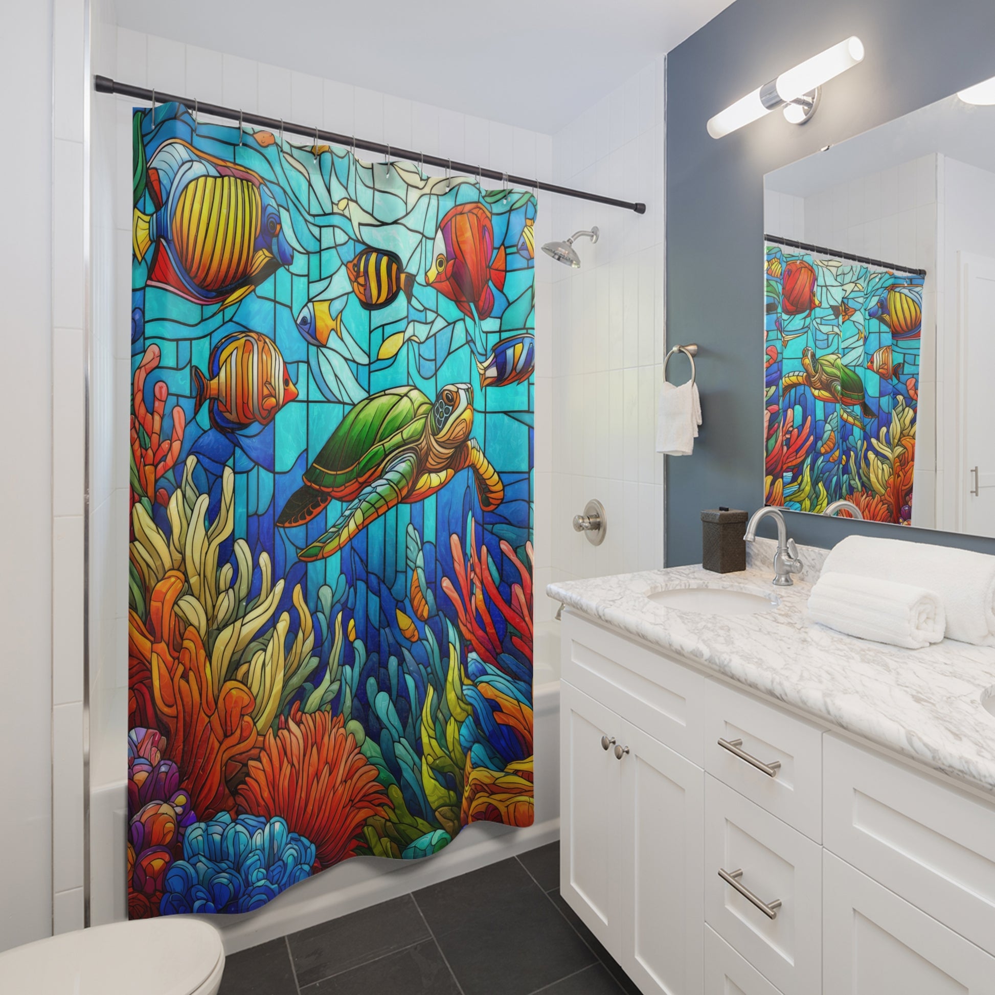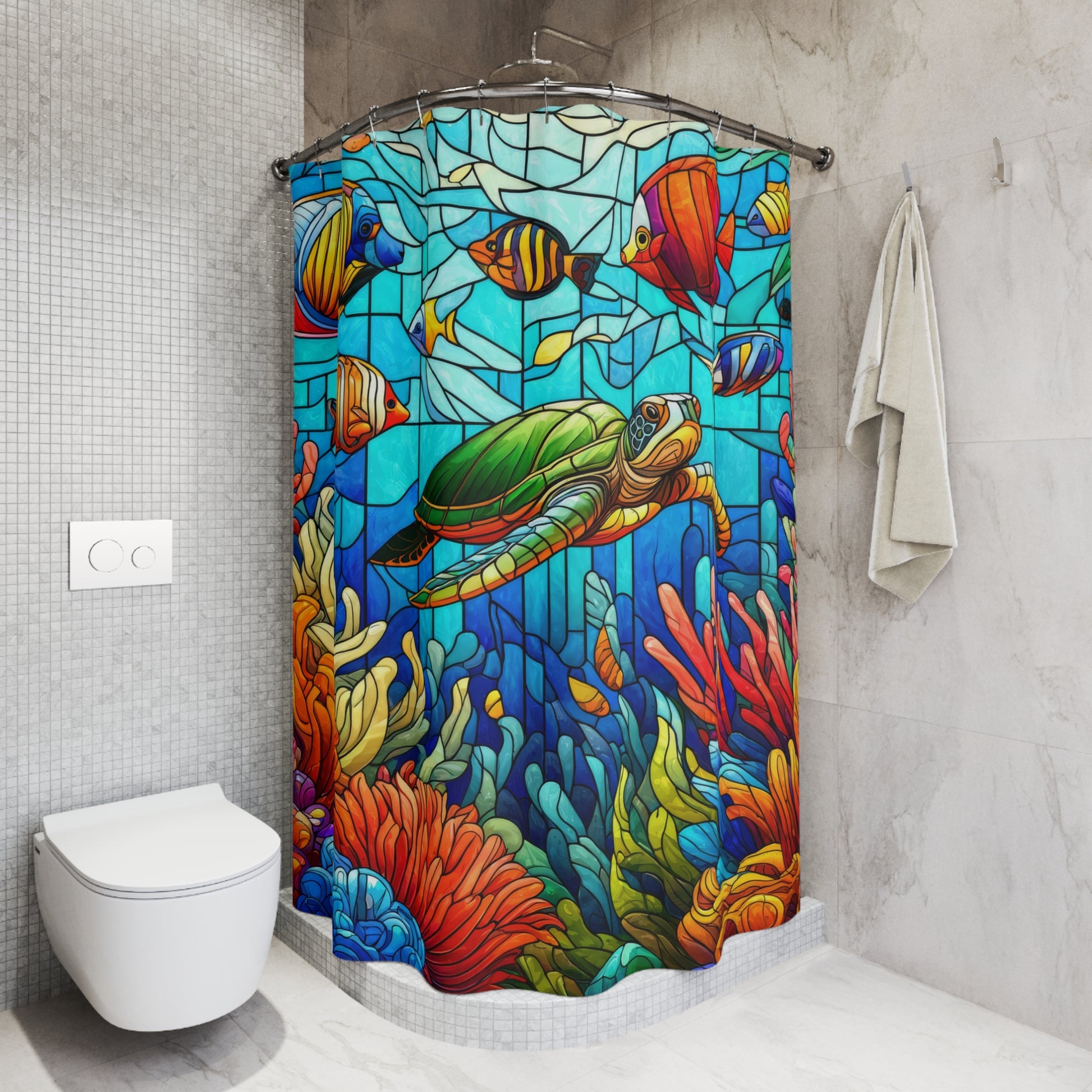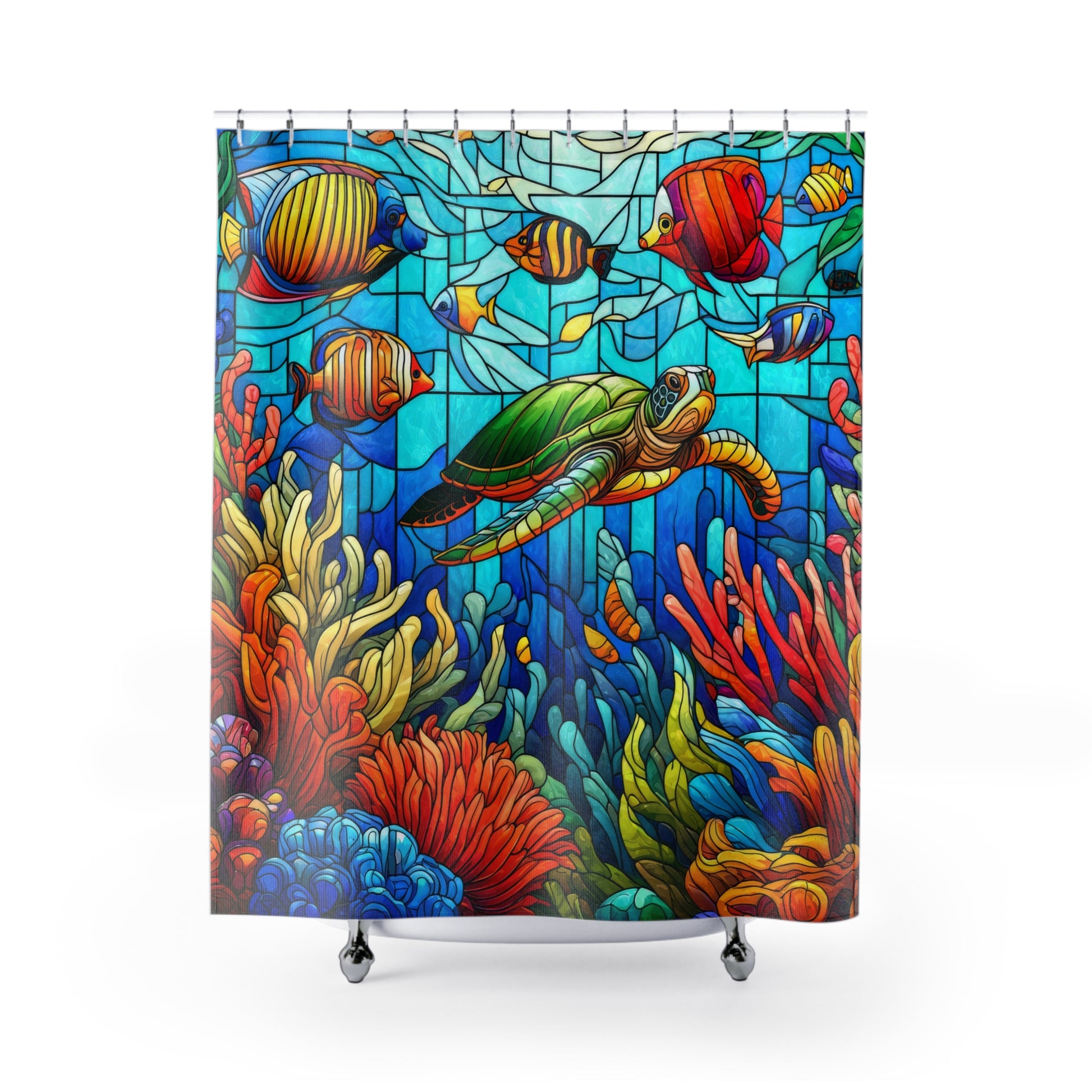 Stained Glass Colorful Tropical Fish, Sea Turtles, and Coral Reef Shower Curtains