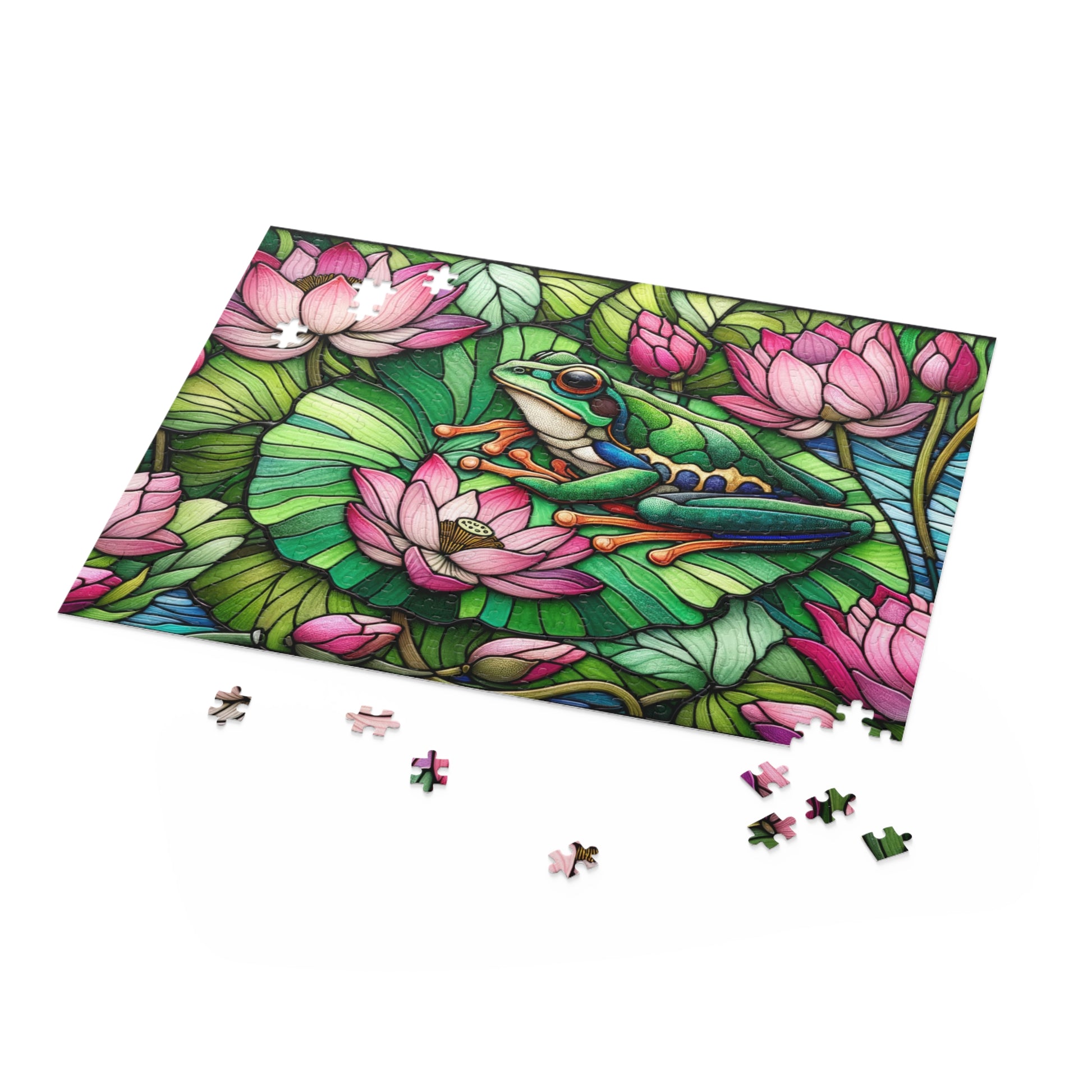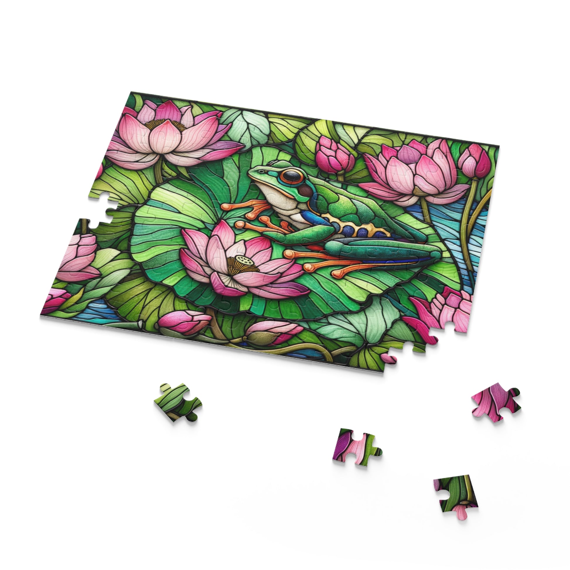 Stained Glass Frog Pink Water Lily Puzzle (120, 252, 500-Piece) Family Jigsaw Puzzle, Puzzle Box Gift