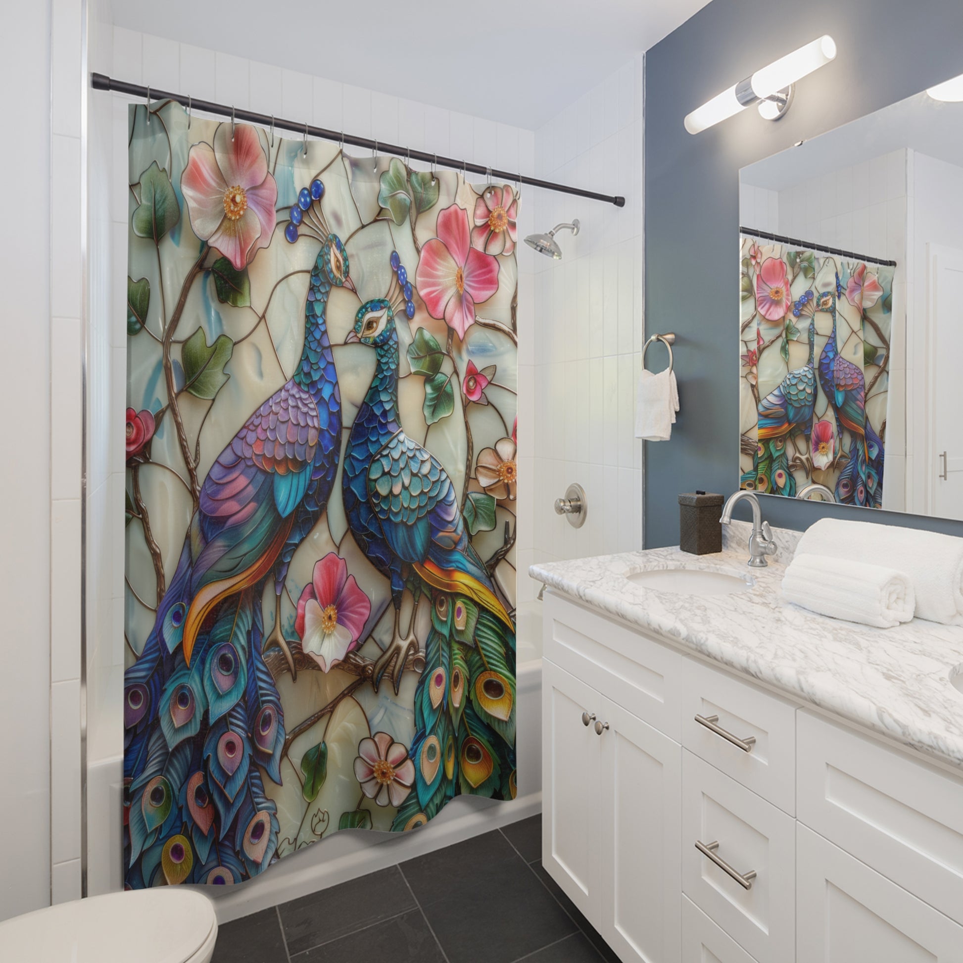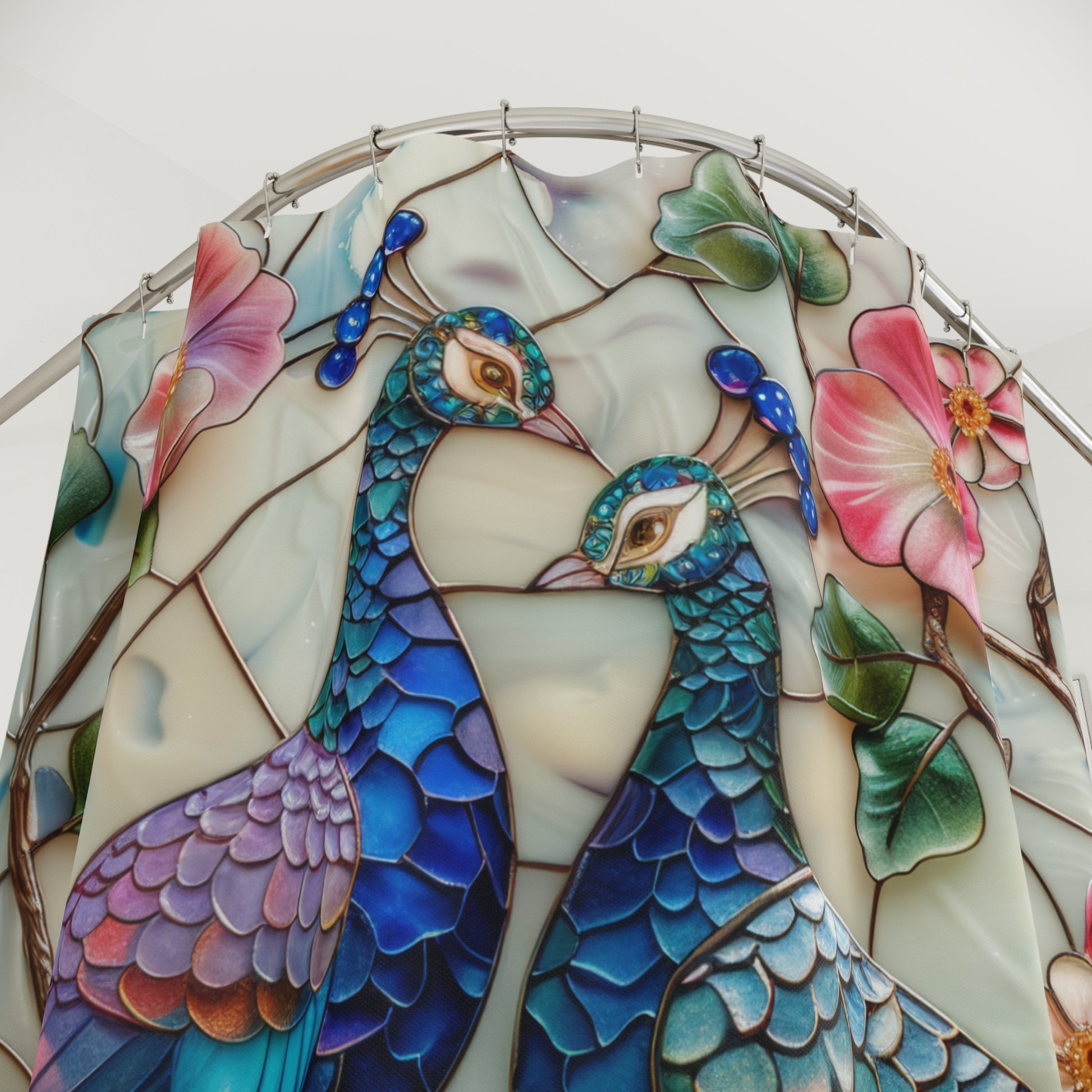 Stained Glass Peacocks Pink Flower Polyester Shower Curtain