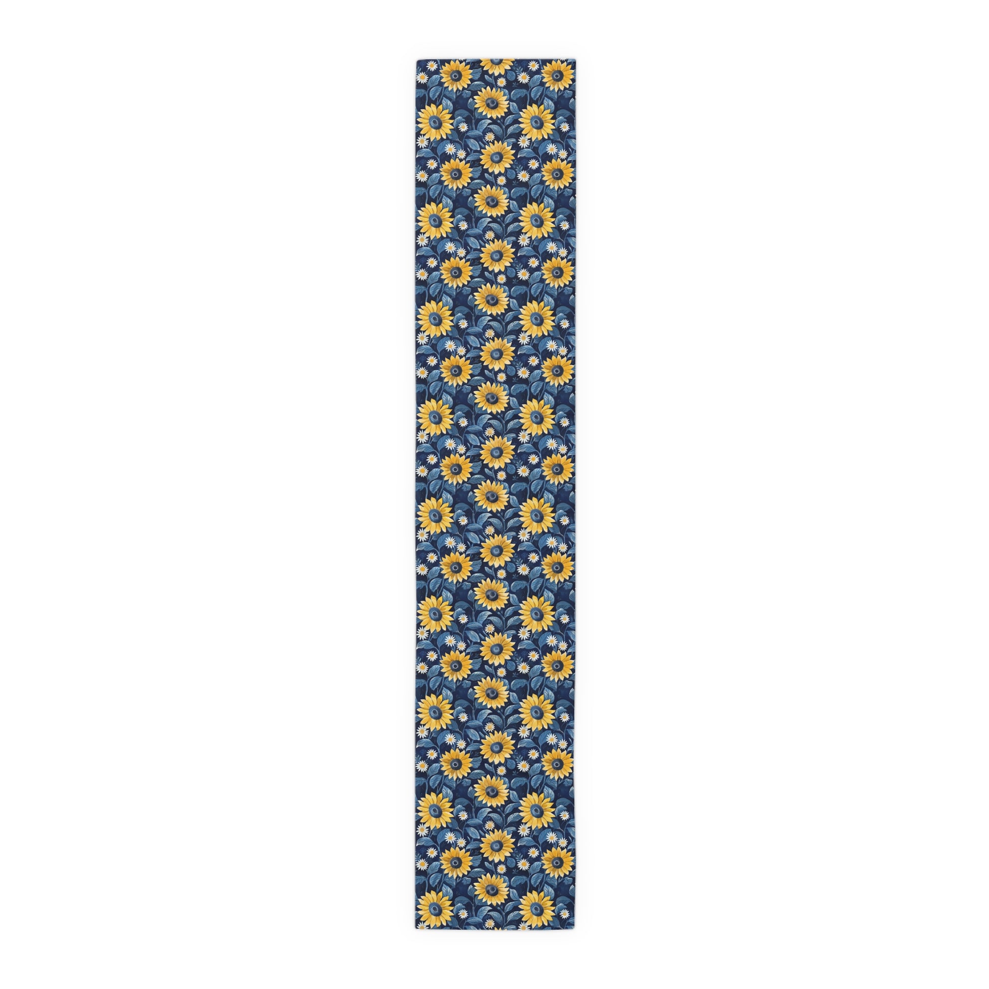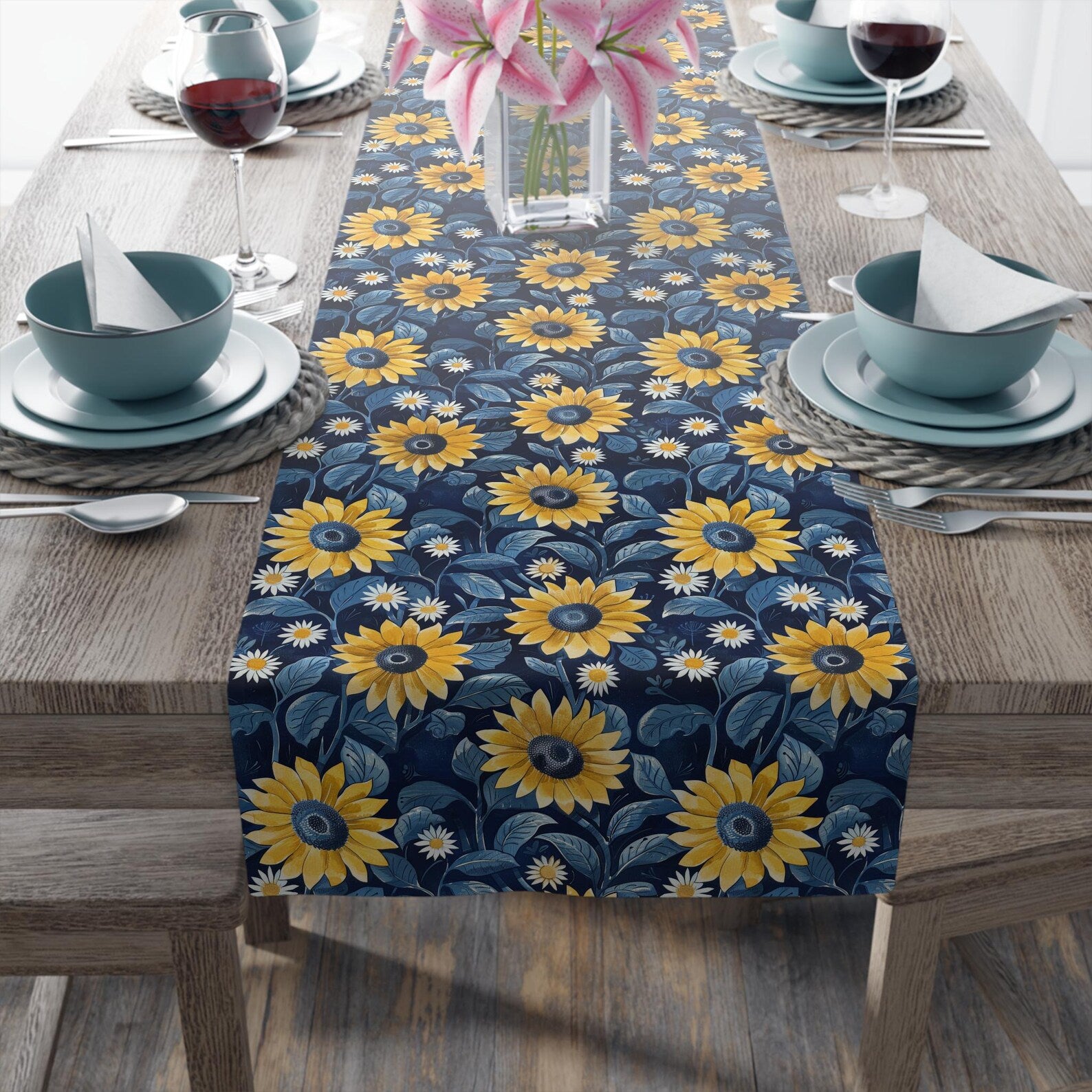 Product Description Elevate your dining experience with this beautifully designed Sunflower Table Runner, crafted to bring a touch of charm and warmth to any occasion. Featuring vibrant yellow sunflowers against a deep navy backdrop, this design radiates joy and creates a stunning centerpiece for your table. Perfect for both casual meals and special gatherings, this runner enhances your dining space with a cheerful, nature-inspired aesthetic. Whether you’re hosting a summer BBQ, fall harvest dinner, holiday feast, or simply enjoying a cozy meal at home, this runner sets the mood for unforgettable moments. A wonderful gift for sunflower lovers, farmhouse decorators, or anyone who enjoys stylish yet practical home décor, this table runner adds timeless beauty to your home. Celebrate birthdays, Thanksgiving, or everyday family dinners with this delightful floral accent.