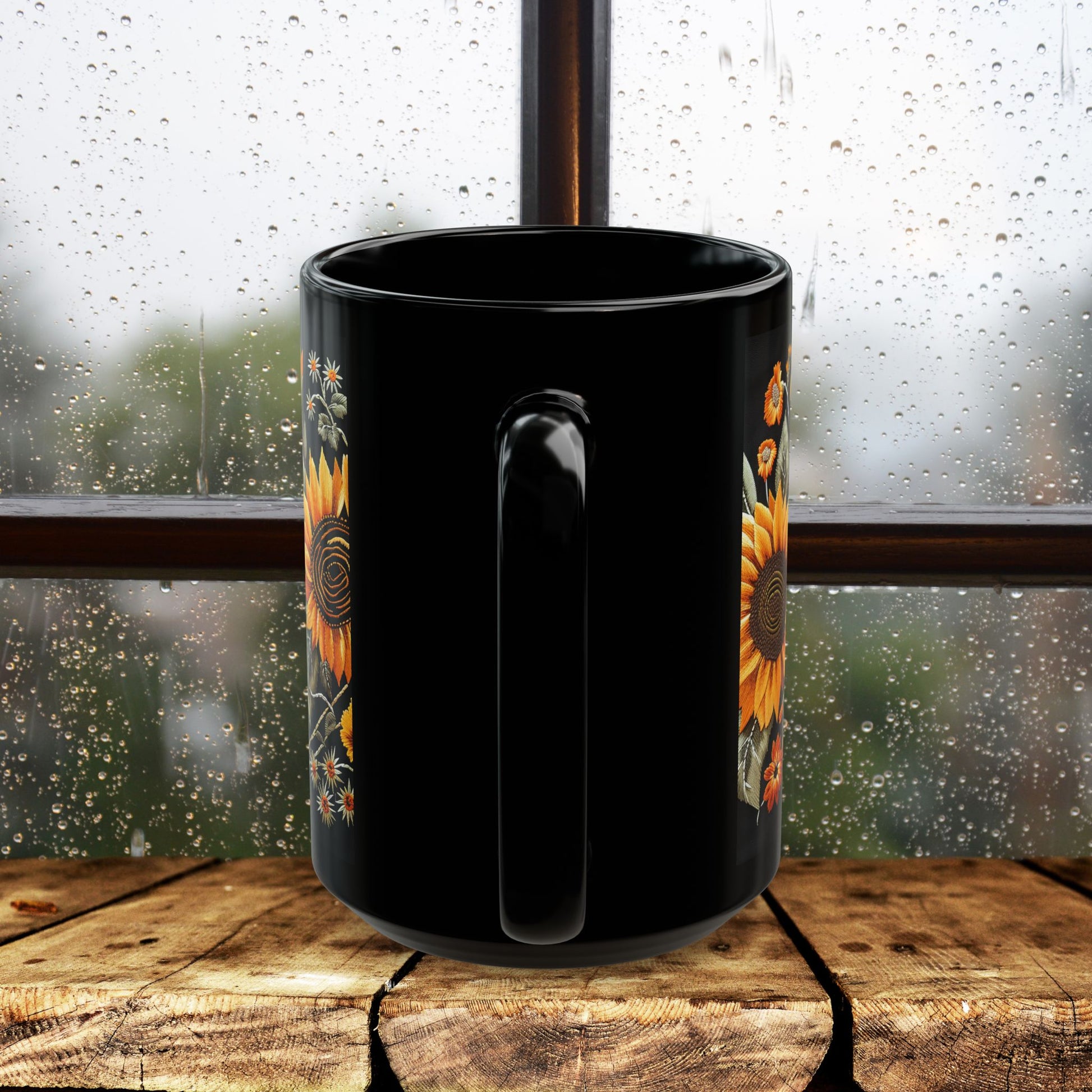Sunflowers Embroidery Black Coffee Mug – Floral Pattern Cup, Botanical Kitchen Decor, Nature Lover Gift, Black Ceramic Drinkware (11oz/15oz)