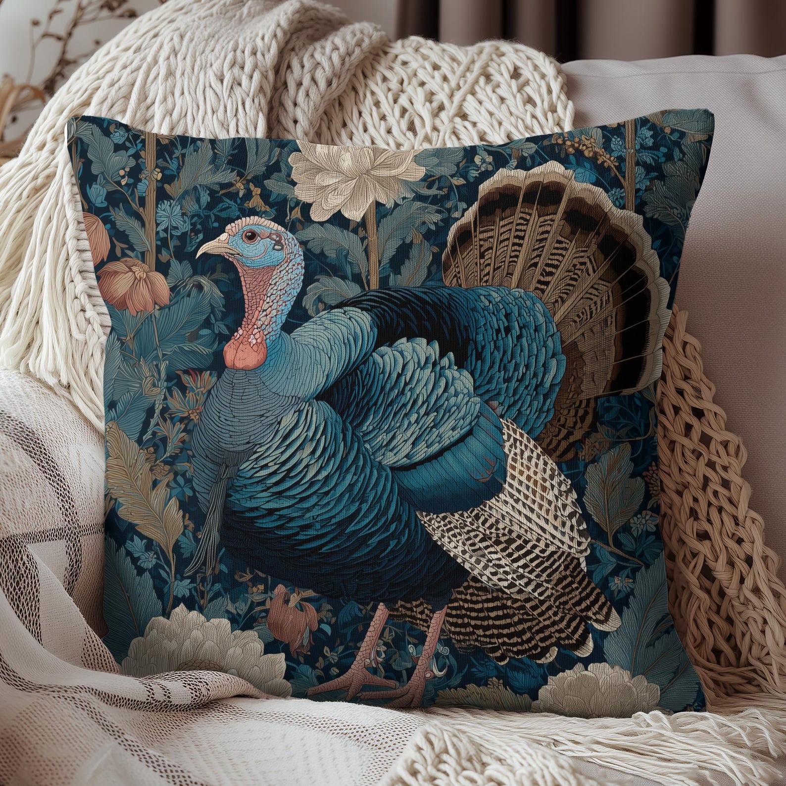 🦃 Product Description: Celebrate the beauty of fall with this majestic Thanksgiving Turkey Pillow. This eye-catching design features a richly illustrated turkey set against an ornate William Morris-inspired botanical backdrop in deep teal, rust, and cream tones. Perfectly blending autumn elegance and vintage charm, this pillow makes a sophisticated statement piece for your Thanksgiving table setting, cozy living room, or rustic entryway. Whether you’re embracing cottagecore aesthetics, traditional harvest decor, or looking for a standout seasonal accent, this turkey pillow offers warmth, character, and timeless artistry. Available in polyester cover only, cover with insert, or polyester outdoor pillow to suit any space.