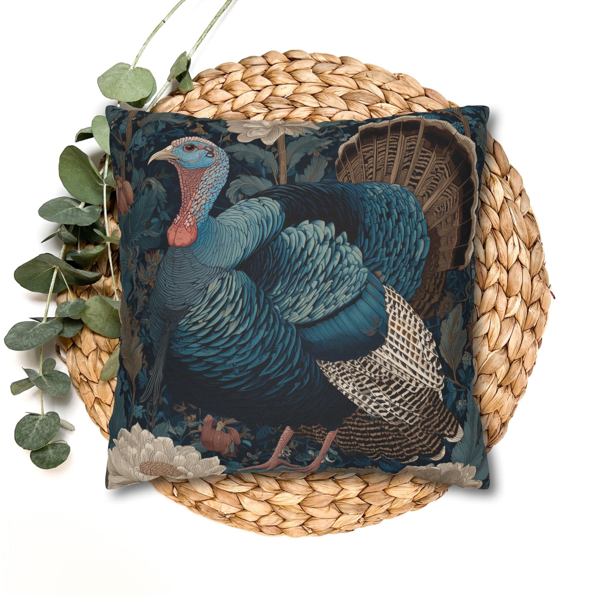 🦃 Product Description: Celebrate the beauty of fall with this majestic Thanksgiving Turkey Pillow. This eye-catching design features a richly illustrated turkey set against an ornate William Morris-inspired botanical backdrop in deep teal, rust, and cream tones. Perfectly blending autumn elegance and vintage charm, this pillow makes a sophisticated statement piece for your Thanksgiving table setting, cozy living room, or rustic entryway. Whether you’re embracing cottagecore aesthetics, traditional harvest decor, or looking for a standout seasonal accent, this turkey pillow offers warmth, character, and timeless artistry. Available in polyester cover only, cover with insert, or polyester outdoor pillow to suit any space.