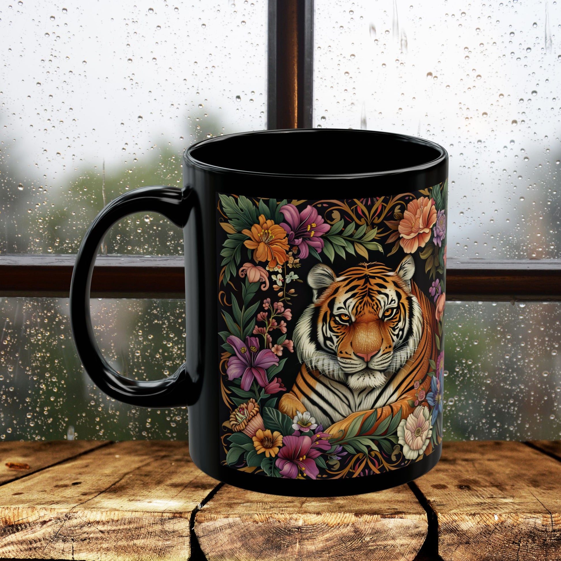 Tropical Tiger William Morris Inspired Black Coffee Mug For Her Him Ceramic Mug Black Mug 11oz, 15oz