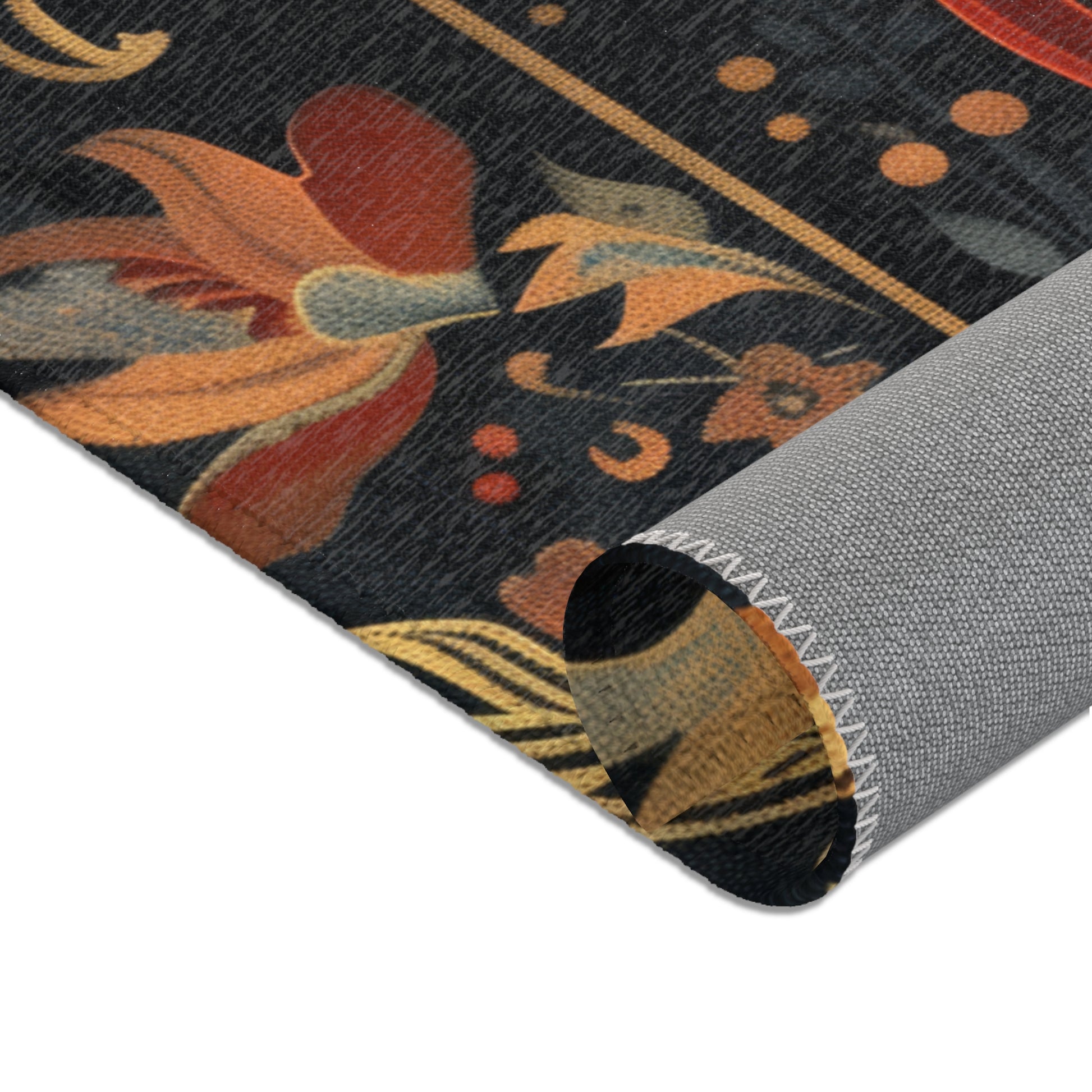 Bring warmth, sophistication, and a touch of legendary beauty into your home with our Phoenix Rising Tapestry Area Rug. This exquisite piece features a majestic phoenix surrounded by ornate botanical patterns in glowing shades of gold, amber, and crimson against a deep charcoal background β creating a striking focal point for any room.