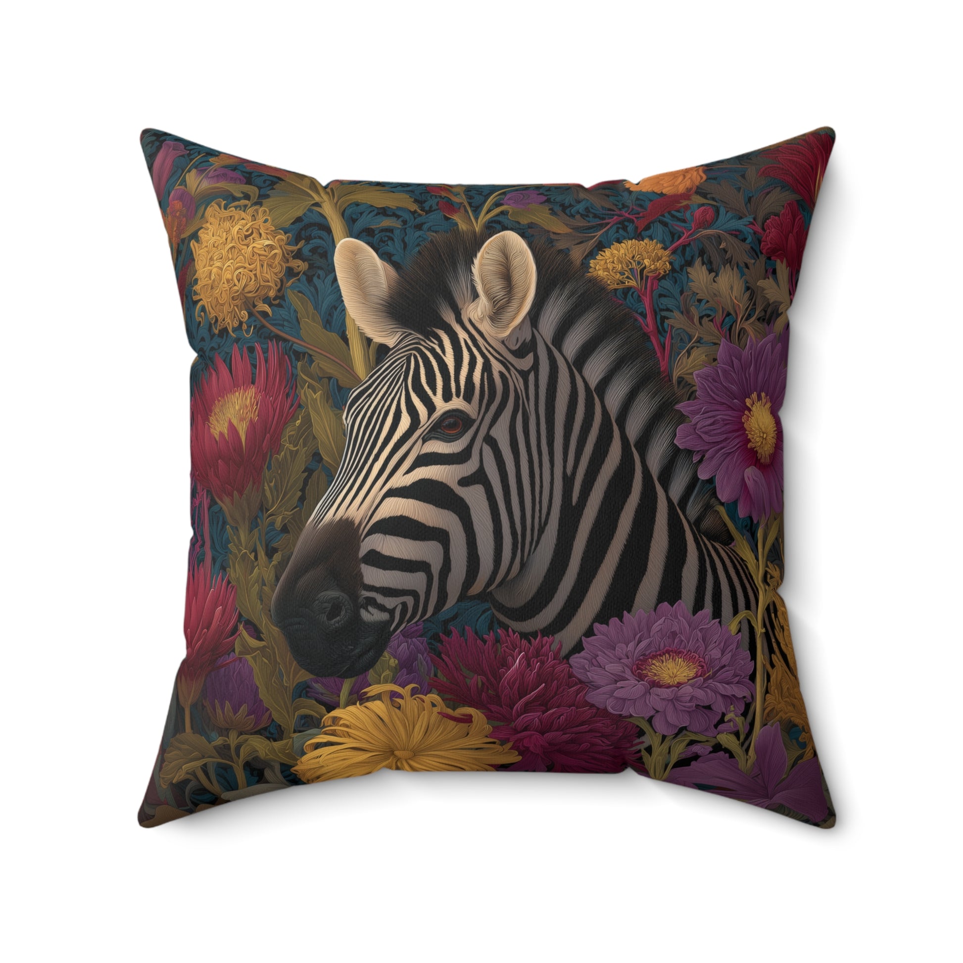 Product Description Make a bold and enchanting statement in your home with this Vibrant Zebra Floral Pillow, designed in a lush William Morris–inspired botanical style. The striking black-and-white zebra is surrounded by dramatic florals—deep magentas, golden yellows, rich purples, and teal foliage—creating a luxurious, tapestry-like composition that feels both wild and elegant. Crafted from durable spun polyester, the pillow cover resists wrinkles, holds its shape, and retains brilliant color over time. The artwork is printed on both sides, giving the pillow a polished, high-end finish no matter how it’s styled. Choose the cover alone, the cover paired with a plush recycled polyester insert, or the outdoor pillow option built for patios, porches, and all-weather display. Perfect for safari-themed décor, eclectic interiors, botanical art lovers, cottagecore homes, or anyone who loves vibrant, whimsical artwork with a sophisticated twist.