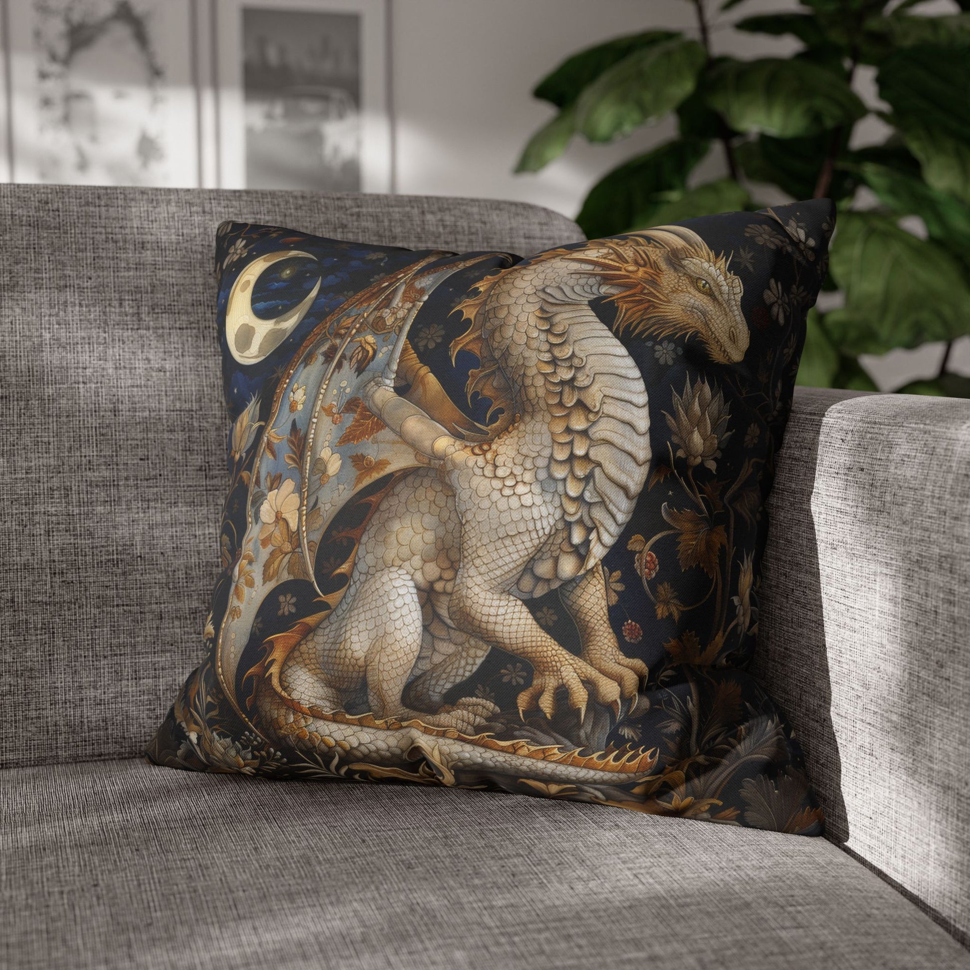 Whimsical Victorian Dragon Crescent Moon And Stars square pillow featuring a double-sided print. Made from spun polyester threads, this pillow is perfect for adding a magical touch to your home decor. Ideal for those who love fantasy and mystical vibes, and relevant for Halloween and celestial-themed celebrations.