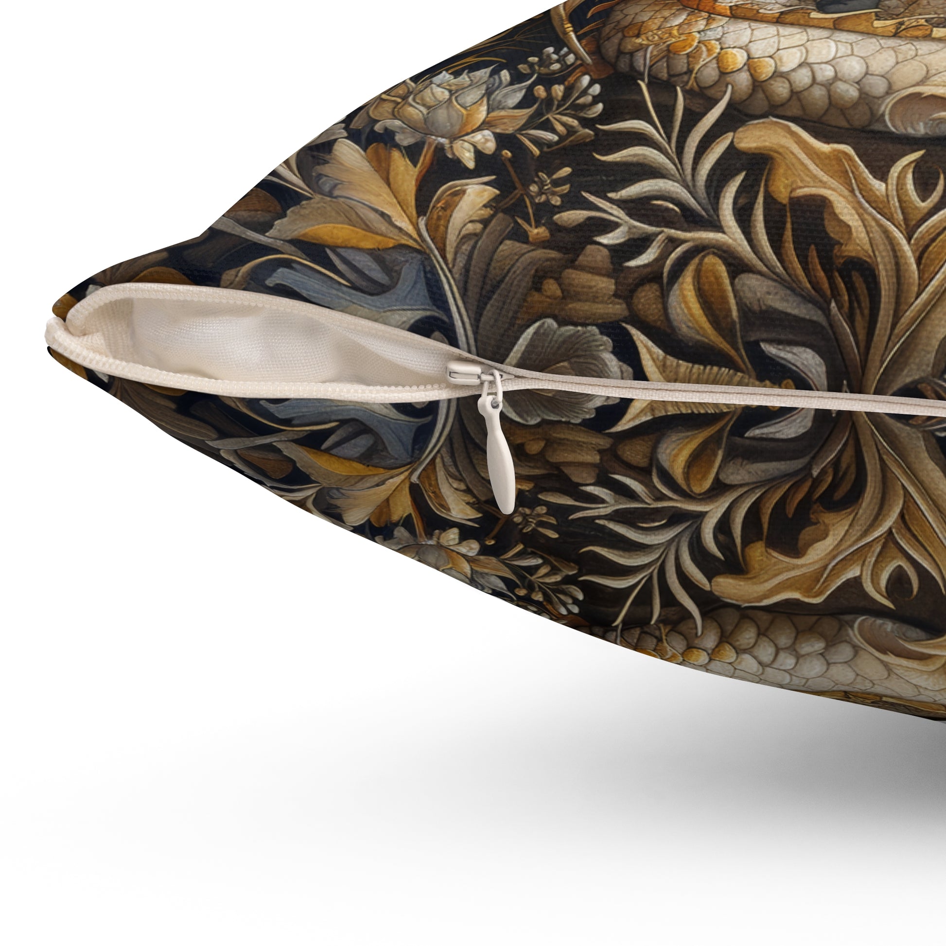 Whimsical Victorian Dragon Crescent Moon And Stars square pillow featuring a double-sided print. Made from spun polyester threads, this pillow is perfect for adding a magical touch to your home decor. Ideal for those who love fantasy and mystical vibes, and relevant for Halloween and celestial-themed celebrations.