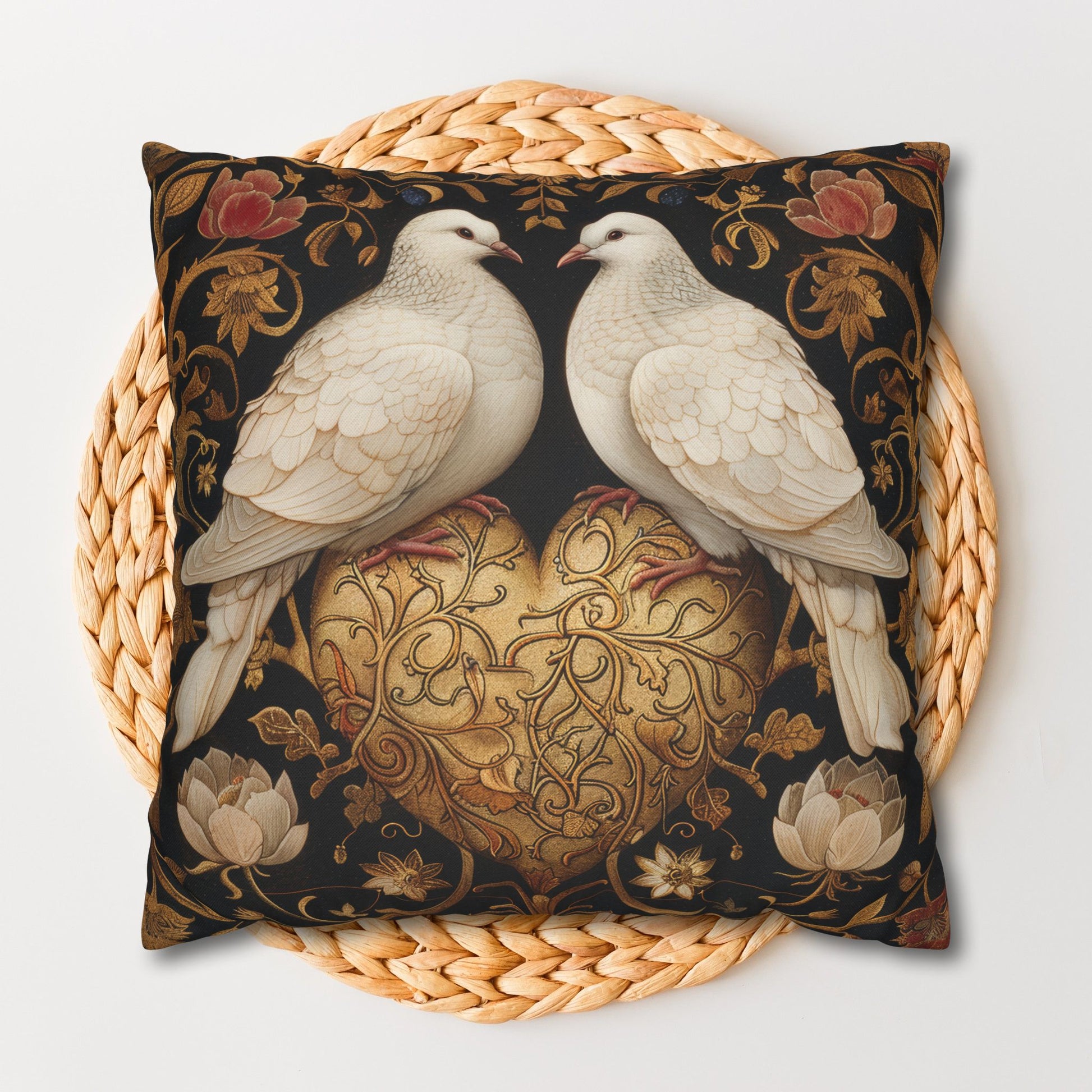 Victorian Lovebirds Pillowcase featuring a golden heart design inspired by William Morris. This elegant and romantic pillowcase is perfect for adding a touch of vintage charm to your home decor. Ideal for those who appreciate intricate designs and classic motifs. Great for Valentine's Day, anniversaries, and weddings.
