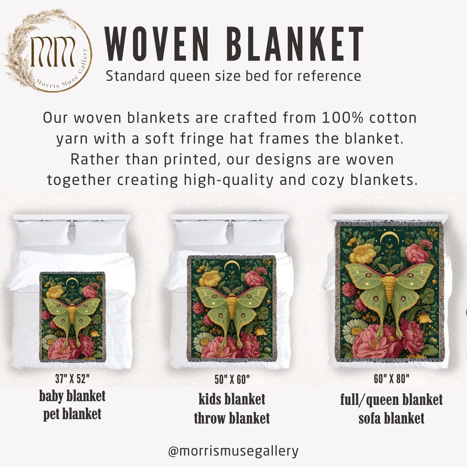 Luna Moth Garden Woven Blanket, Botanical Boho Tapestry Throw, Mystical Floral Nature-Inspired Home Decor