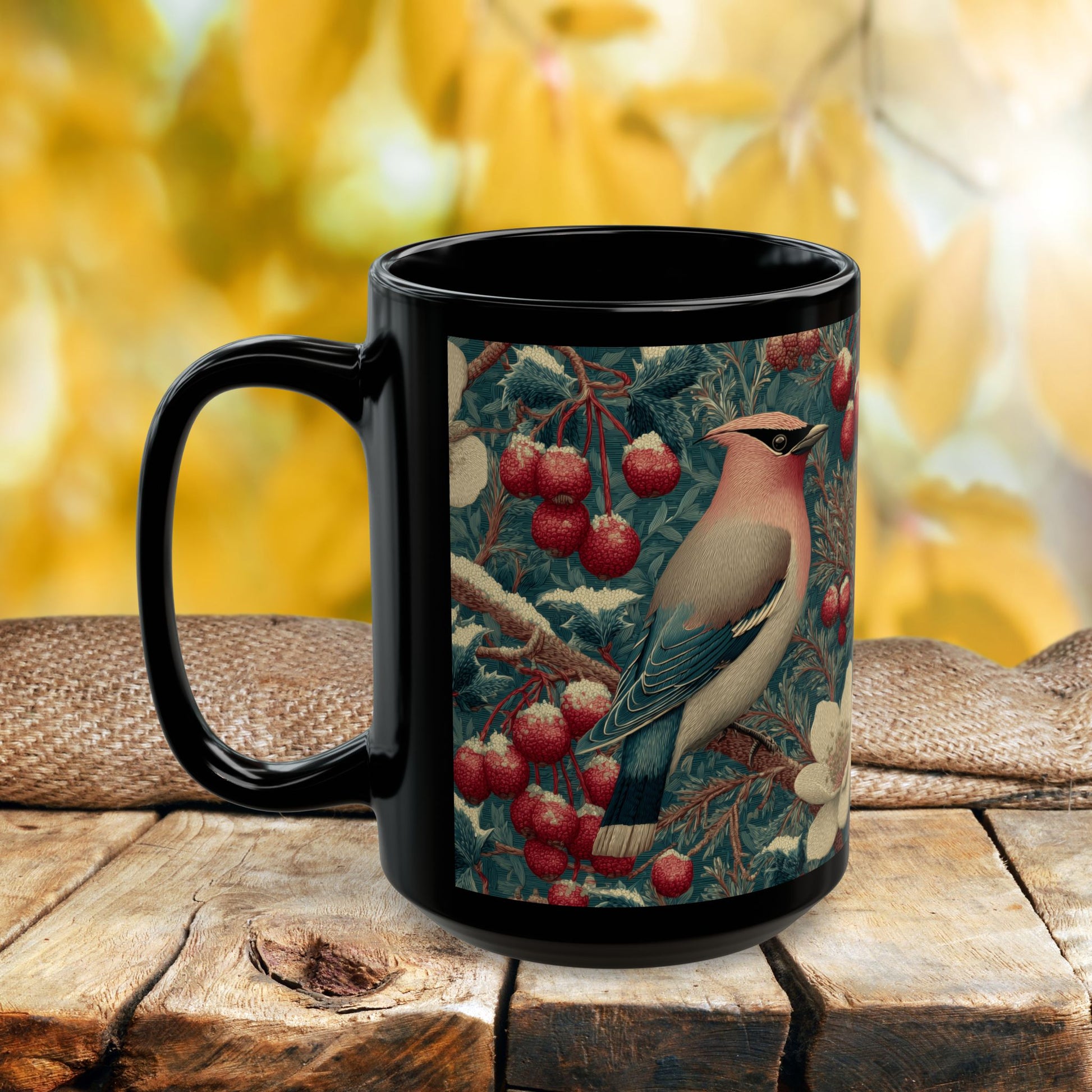 Product Description Celebrate the quiet beauty of winter woodlands with this Waxwing Bird Mug, featuring a richly detailed illustration of a cedar waxwing perched among clusters of red berries, pine sprigs, and vintage-inspired florals. The blend of muted peach, deep teal, evergreen, and warm red tones creates a cozy, storybook atmosphere that feels timeless and enchanting. Printed on a glossy black ceramic mug, the artwork wraps seamlessly around the cup, highlighting each feather and berry with exceptional clarity. The contrast between the dark background and the intricate botanical details makes this mug a stunning piece for both daily use and decorative display. Available in 11oz and 15oz sizes, it’s sturdy, comfortable to hold, and fully dishwasher and microwave safe—perfect for morning coffee, evening tea, or hot chocolate by the fire. Ideal for bird watchers, cottagecore fans, woodland art lovers, nature enthusiasts, and anyone who appreciates beautifully crafted drinkware. This mug also makes a thoughtful holiday, birthday, or wintertime gift.