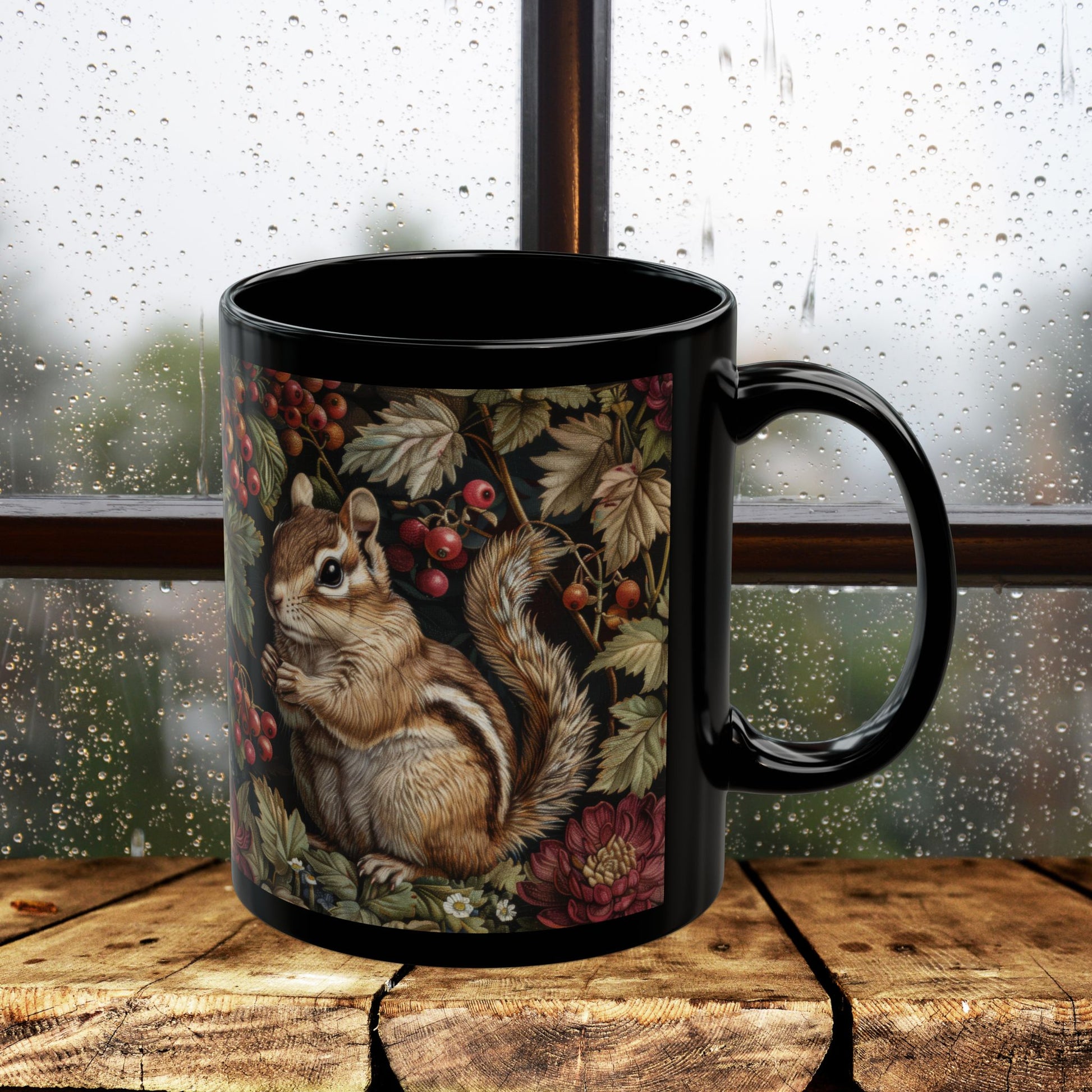 Whimsical Chipmunk Autumn Mug – Black Ceramic Woodland Animal Cup – 11oz & 15oz Fall Forest Nature Coffee Mug for Animal Lovers