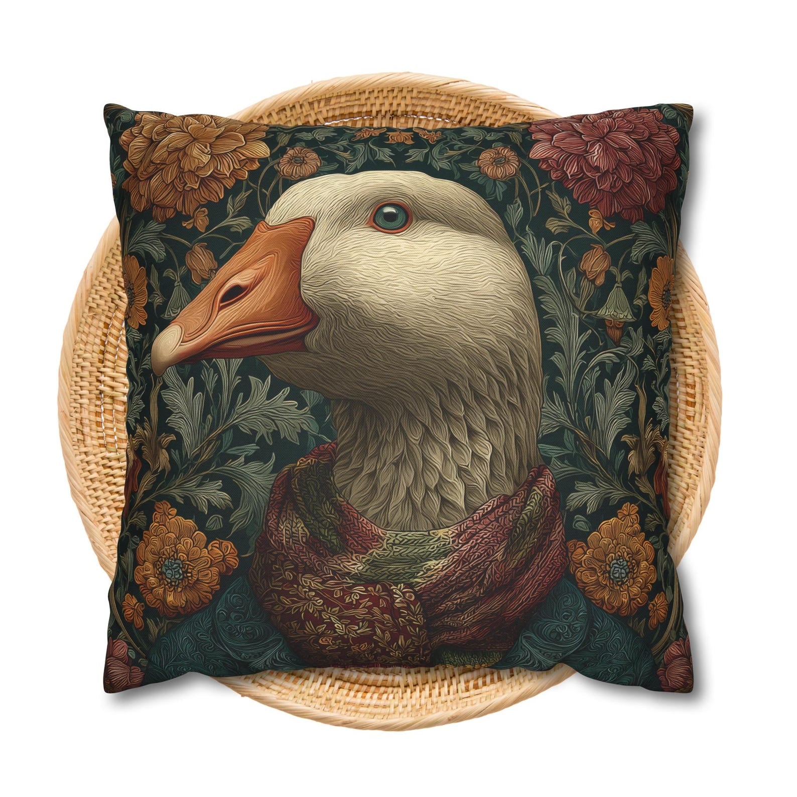 Make your home delightfully charming with this Regal Goose Throw Pillow! Showcasing a beautifully illustrated white goose dressed in ornate Victorian clothing, this pillow is inspired by the timeless elegance of William Morris-style floral patterns. The warm golden and maroon florals combined with the goose’s noble gaze create a whimsical blend of storybook charm and refined countryside flair.