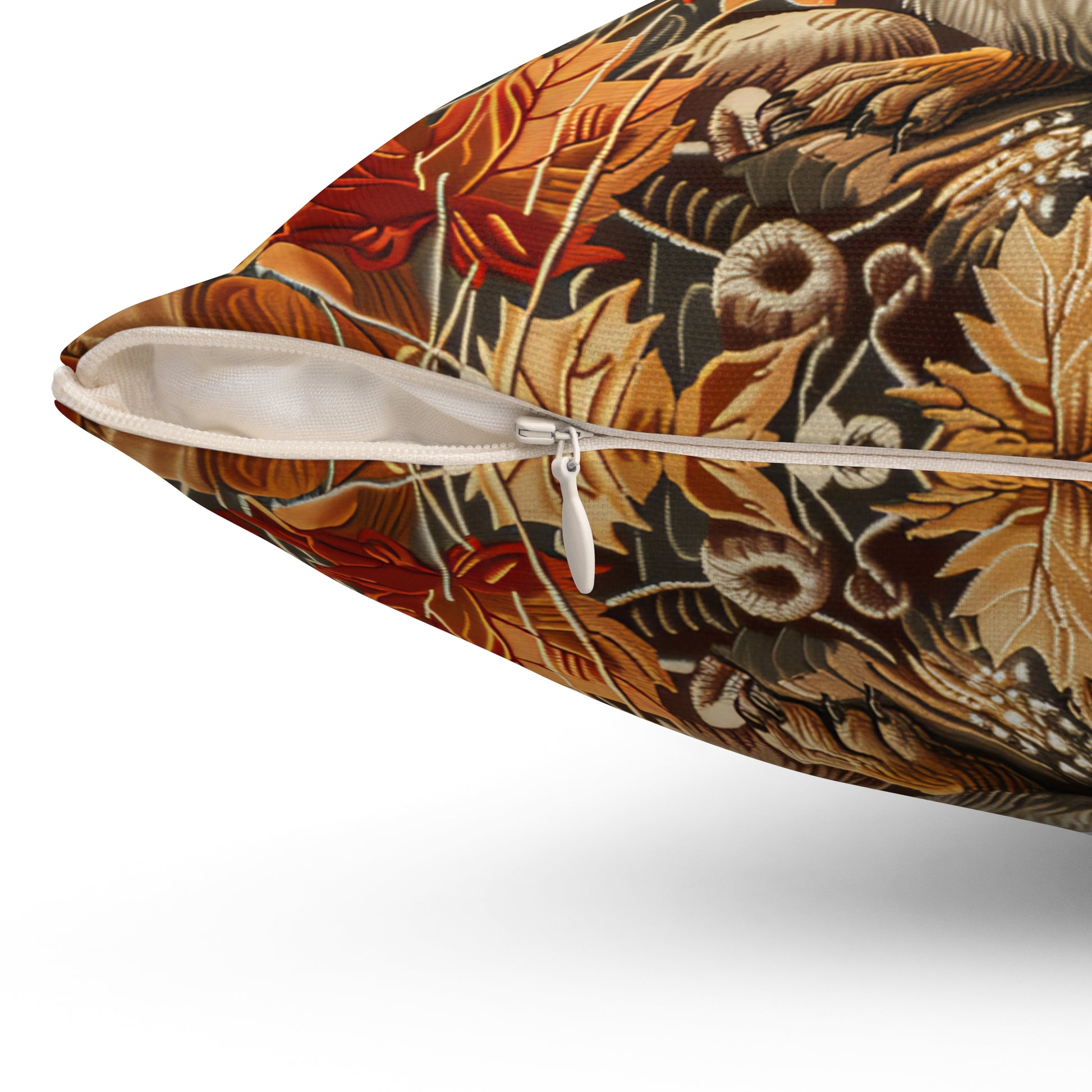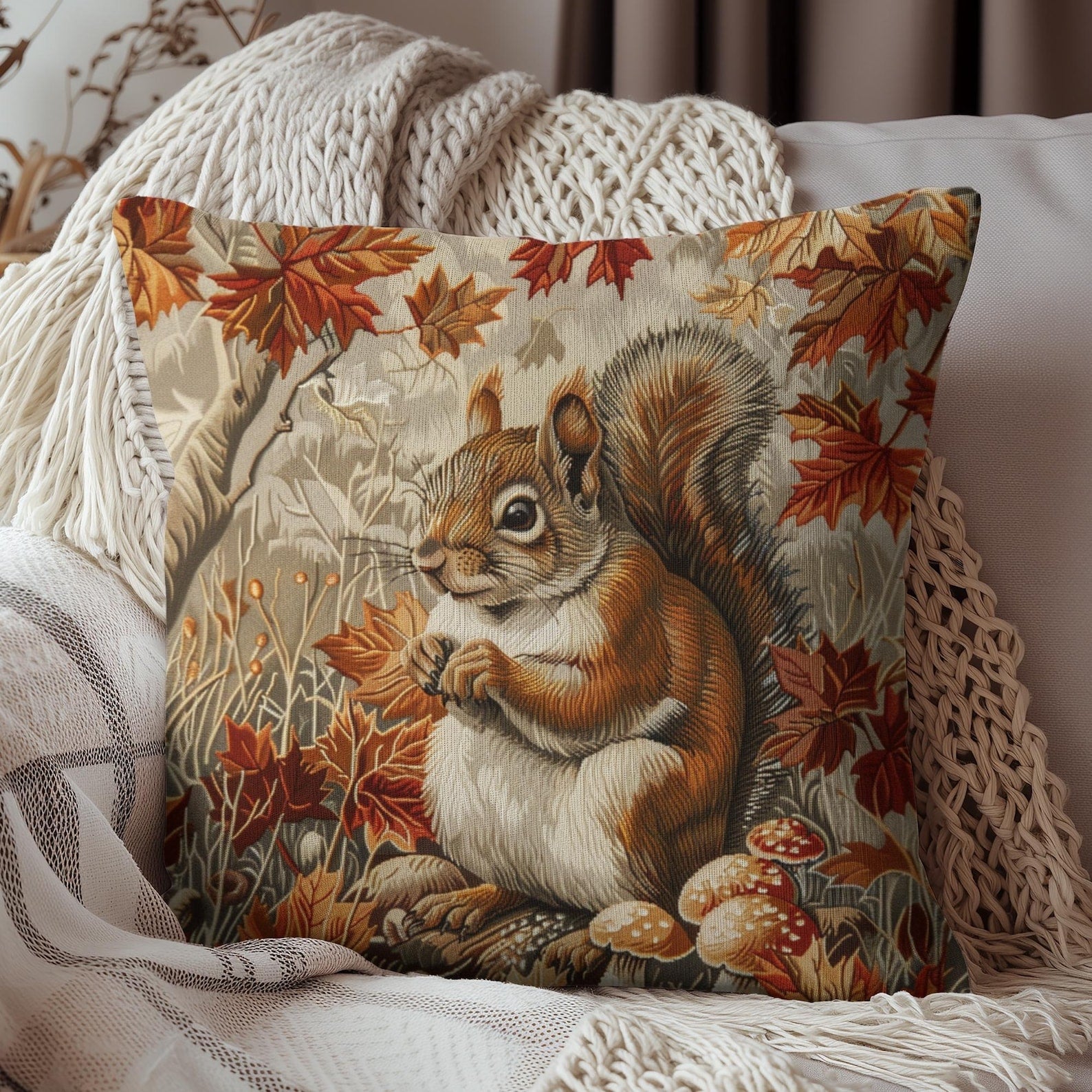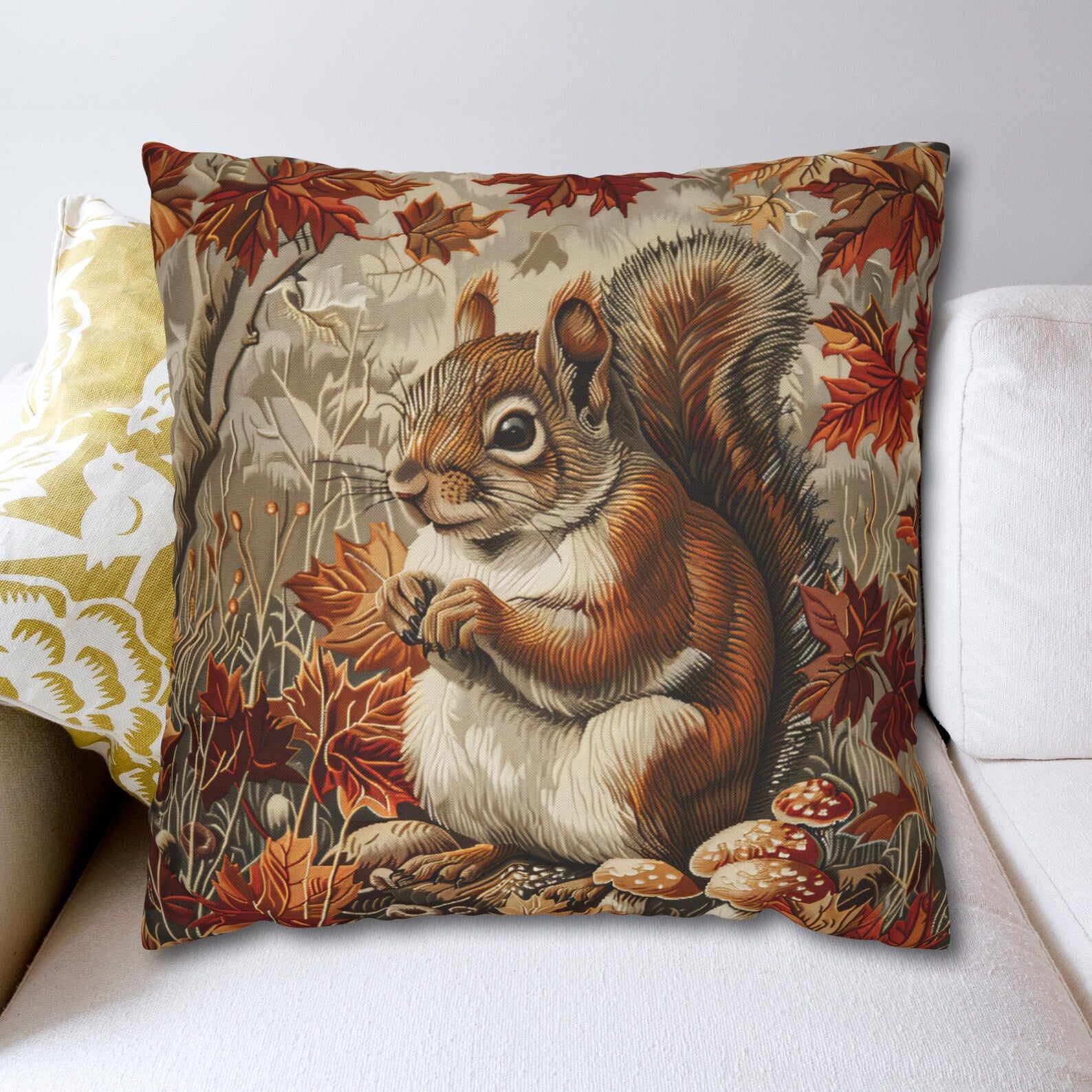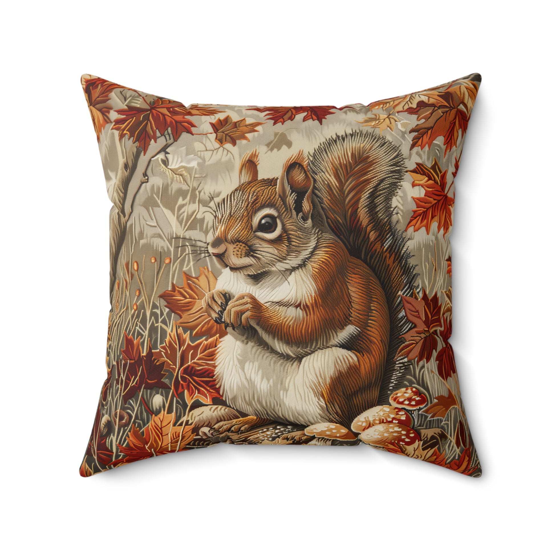 This William Inspired Woodland Brown Squirrel Fall Autumn Forest Decorative Square Pillow brings a cozy and festive vibe to any living space, perfect for fall and Halloween enthusiasts. It features a double-sided print with a concealed zipper for easy removal. Made from 100% spun polyester with a polyester pillow insert, this pillow retains its shape and provides extra volume for comfort. A beige plastic zipper with a metal head adds a stylish touch to the design.