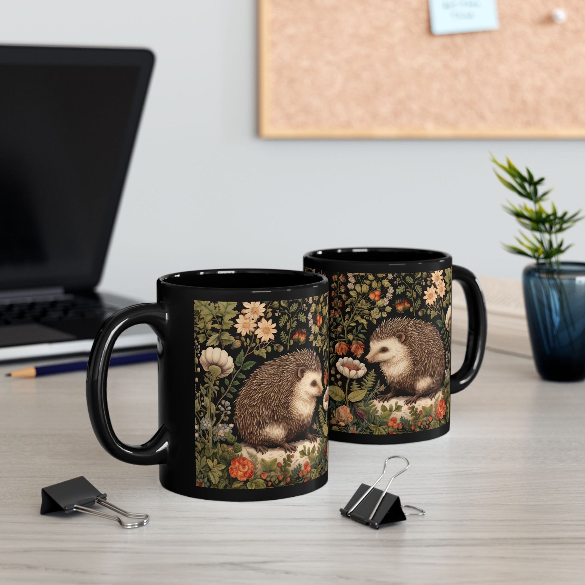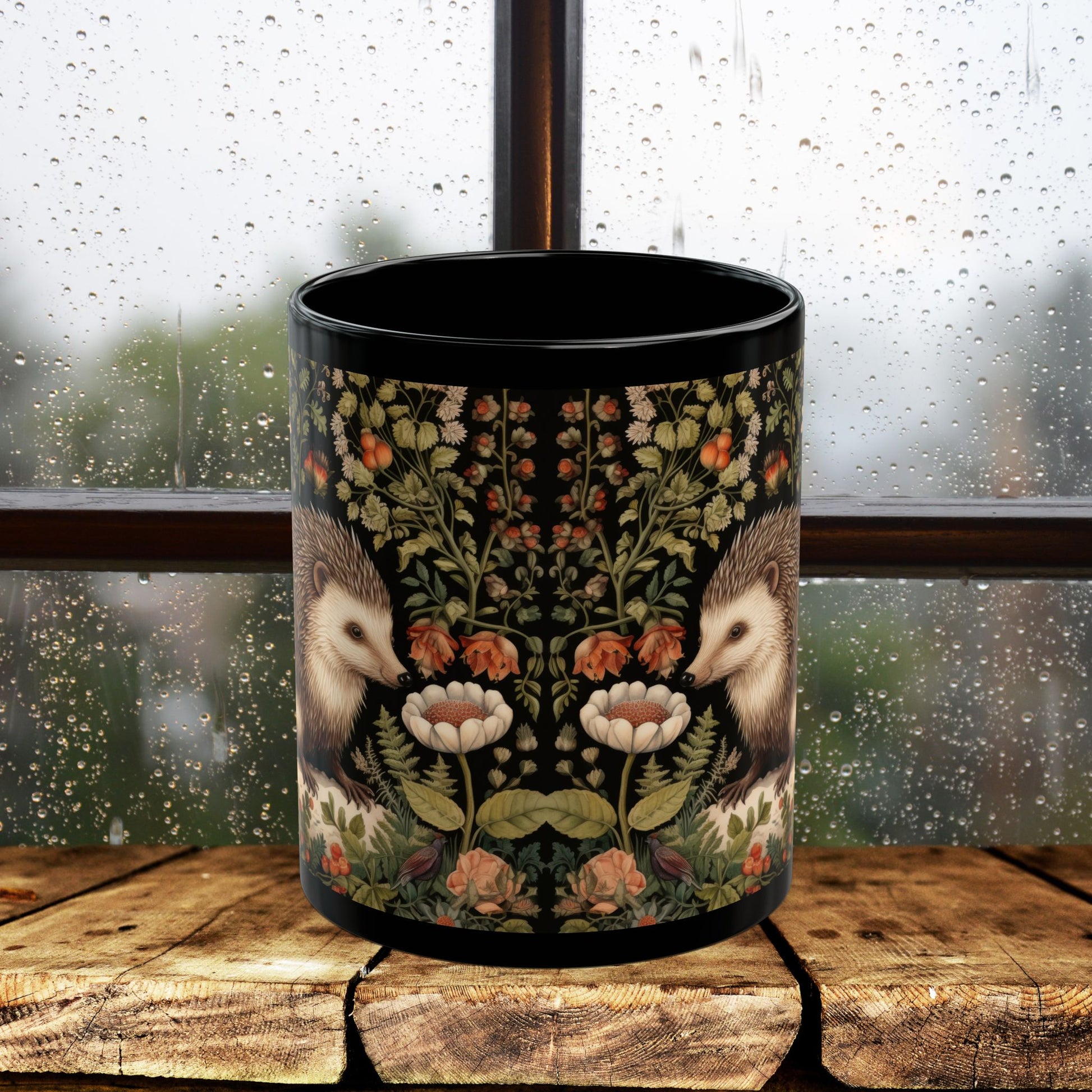 Botanical Hedgehog Black Coffee Mug – William Morris Inspired Ceramic Cup, Woodland Animal Drinkware, Nature Lover Gift (11oz/15oz)