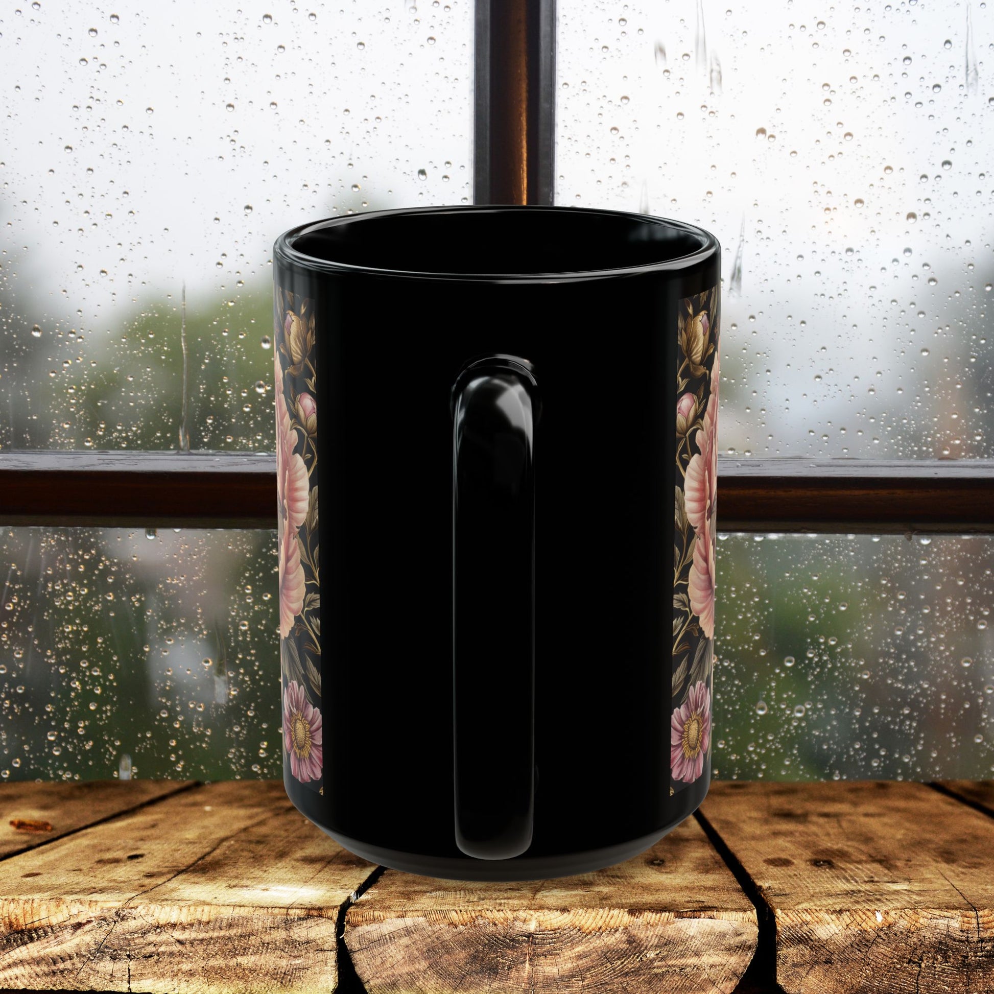 William Morris Inspired Bumblebee Pink Peony Black Coffee Mug For Her Him Ceramic Mug Black Mug 11oz, 15oz