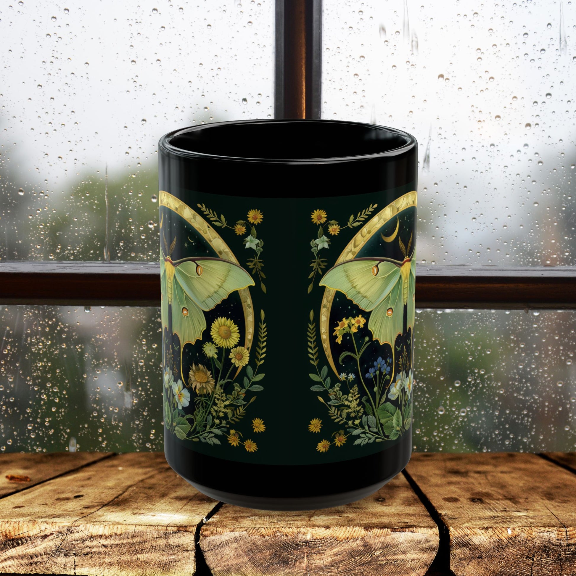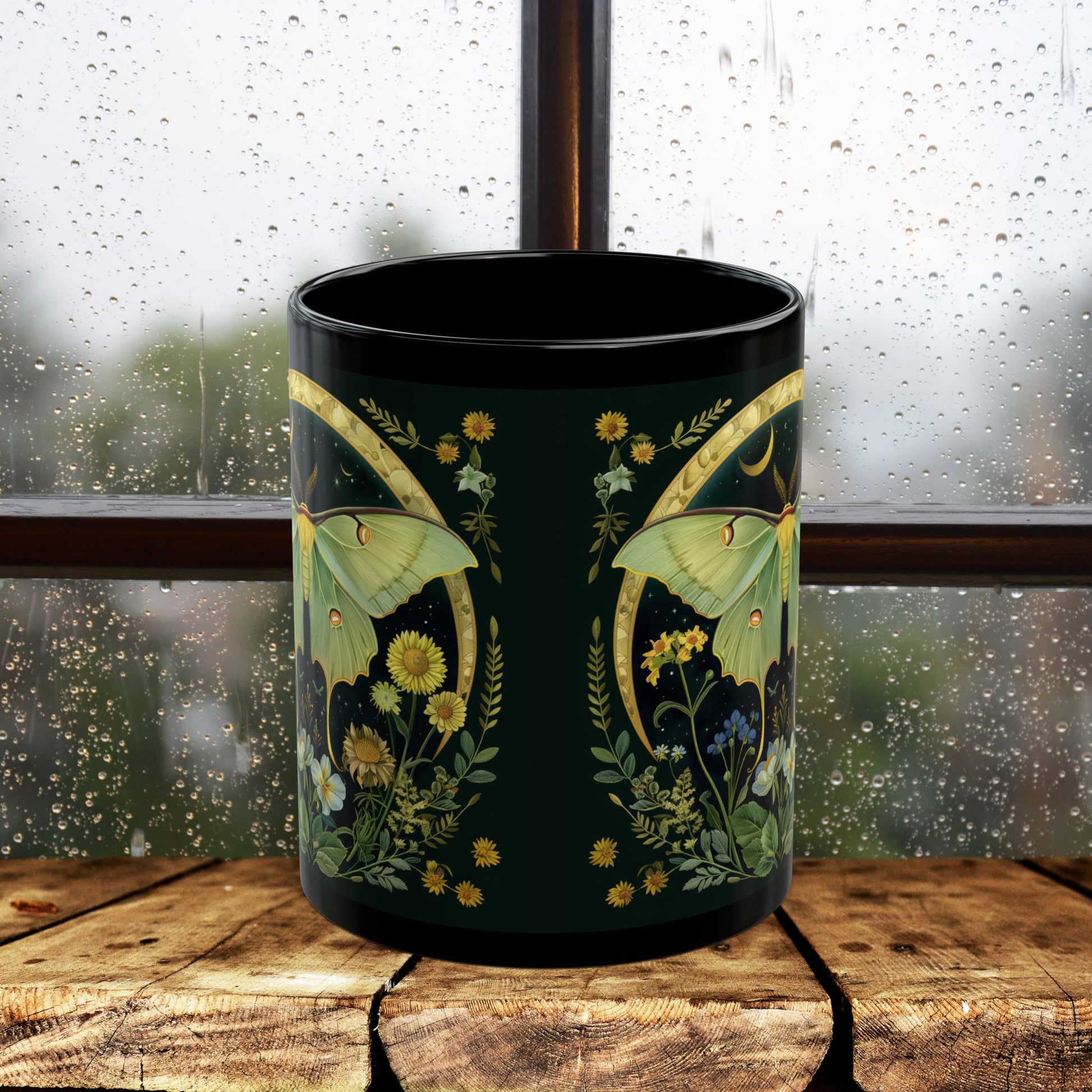 William Morris Inspired Luna Moth Crescent Moon Black Coffee Mug 11oz | Magical Luna Moth Ceramic Black Mug Gift