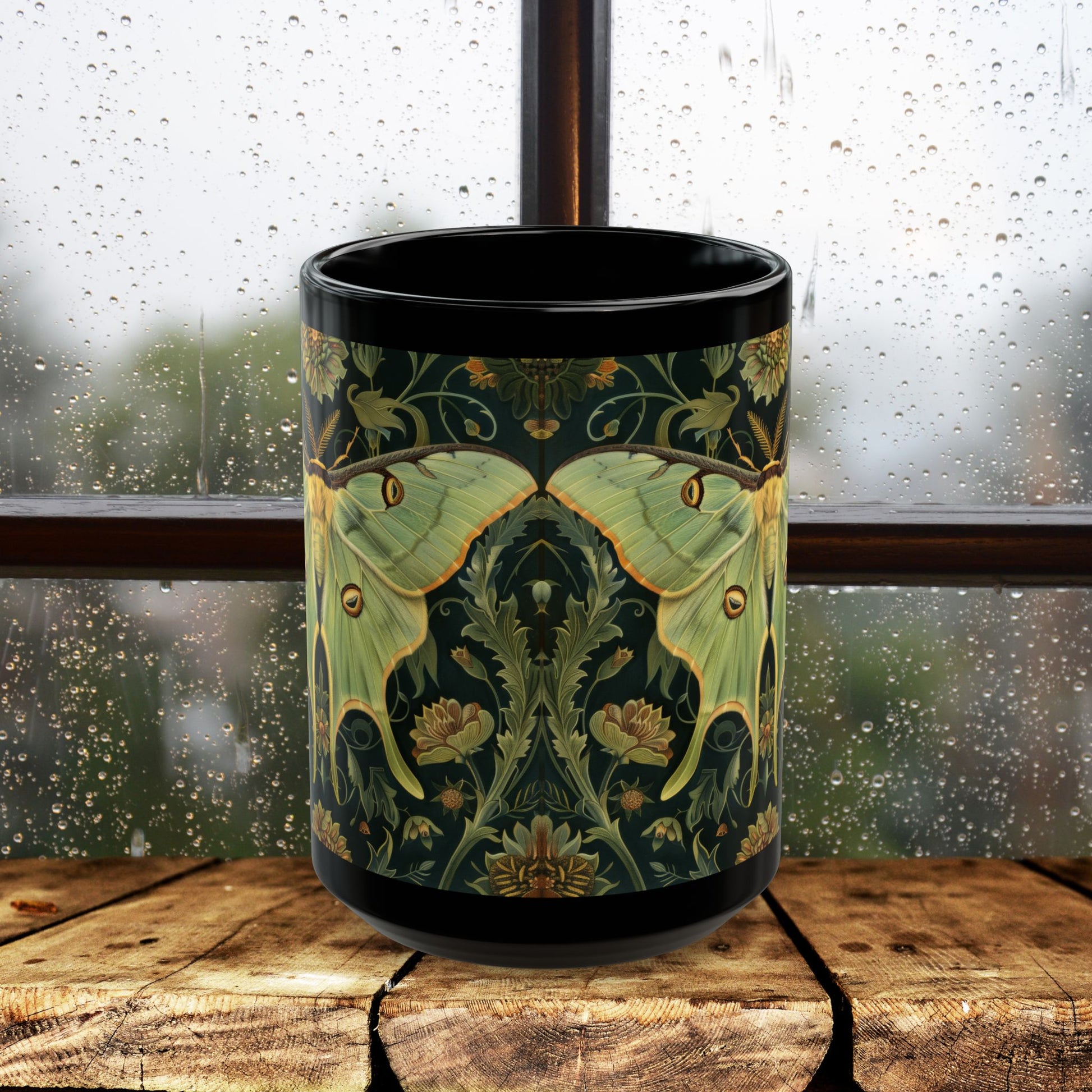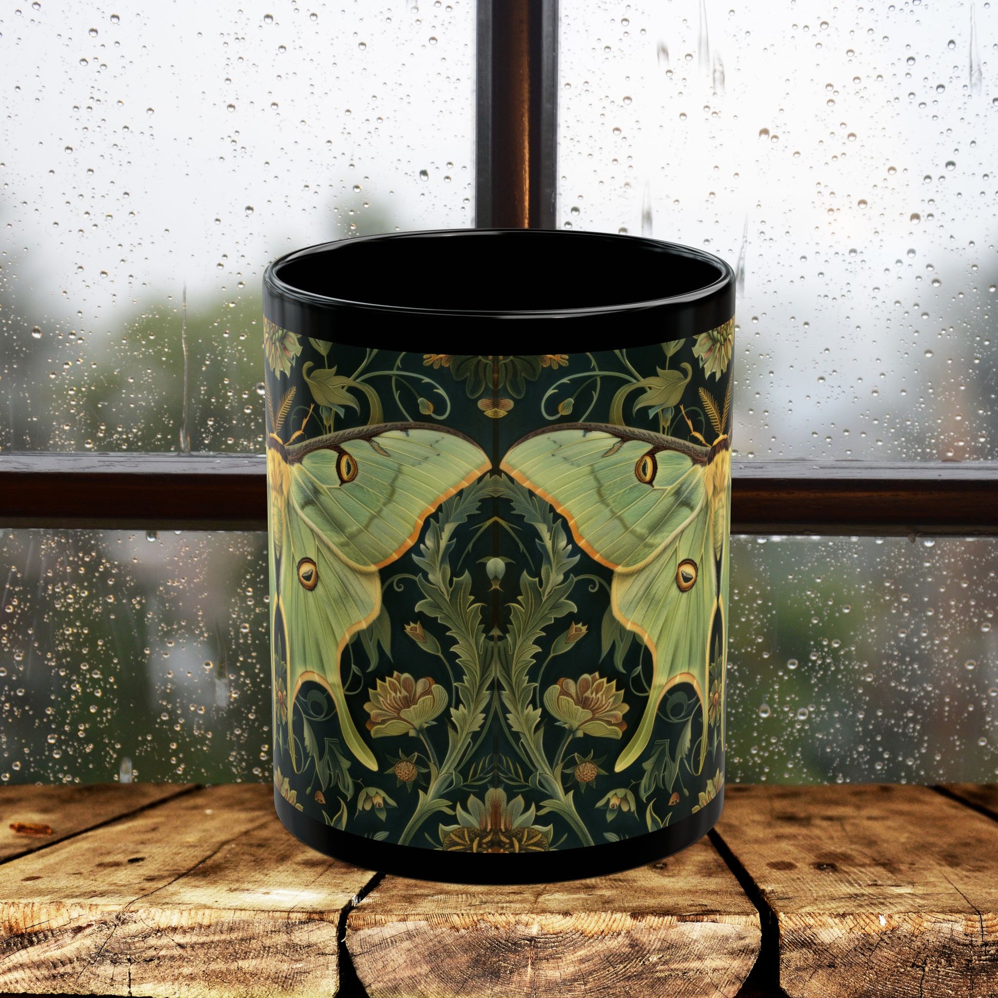 Woodland Luna Moth William Morris Inspired Black Coffee Mug For Her Him Ceramic Mug Black Mug 11oz, 15oz