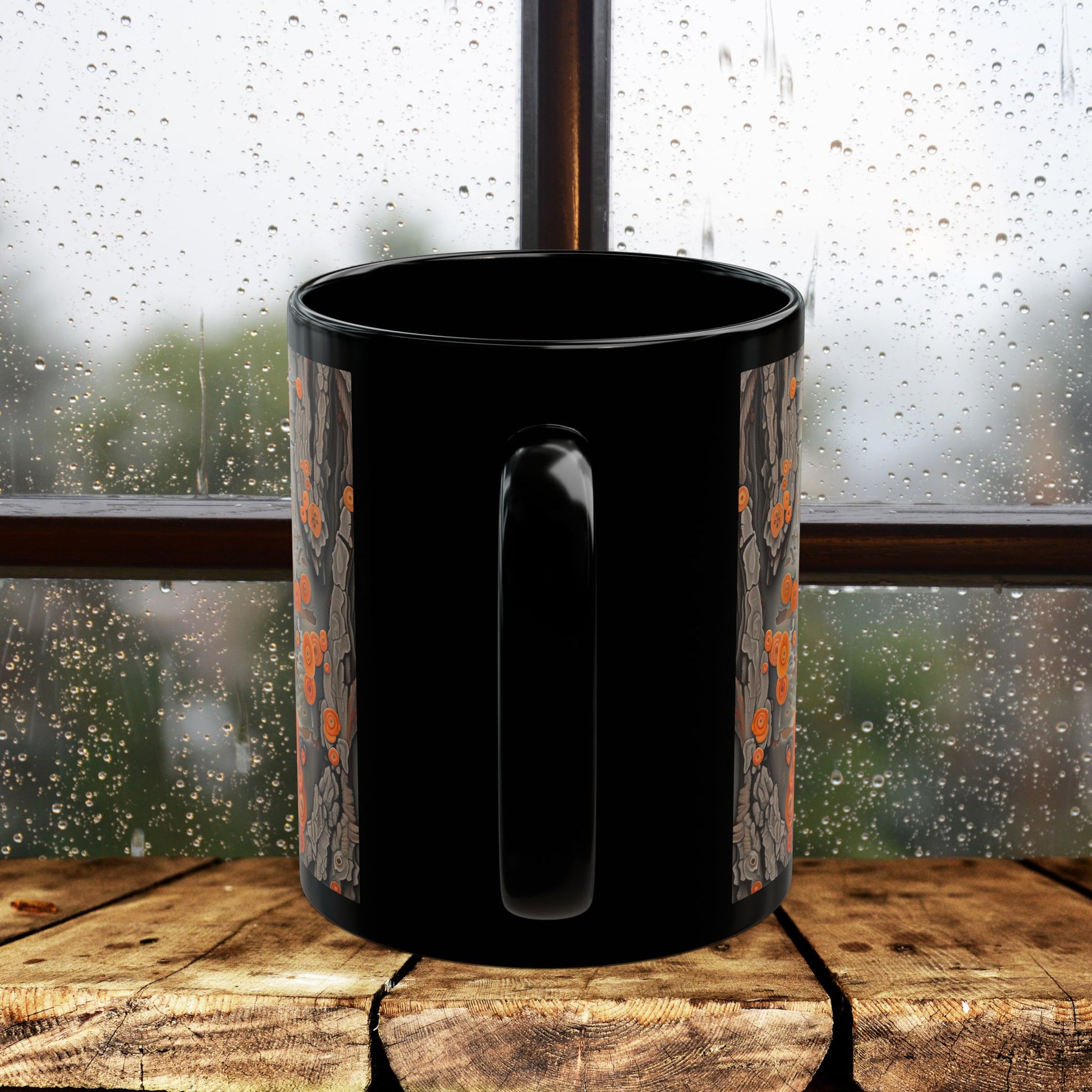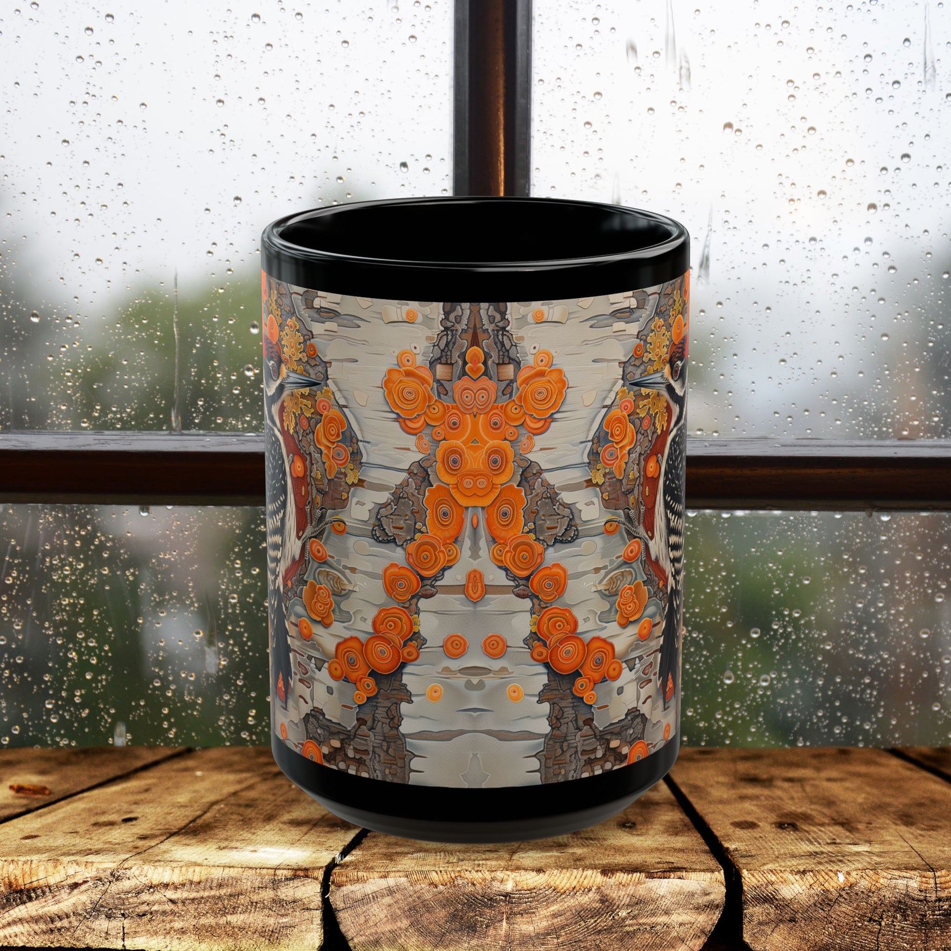Elevate your daily coffee ritual with this Woodpecker & Birch Floral Black Mug. Featuring a beautifully detailed illustration of a woodpecker perched on birch bark, surrounded by vibrant orange florals and intricate natural textures, this mug brings the bold beauty of the forest right into your hands.