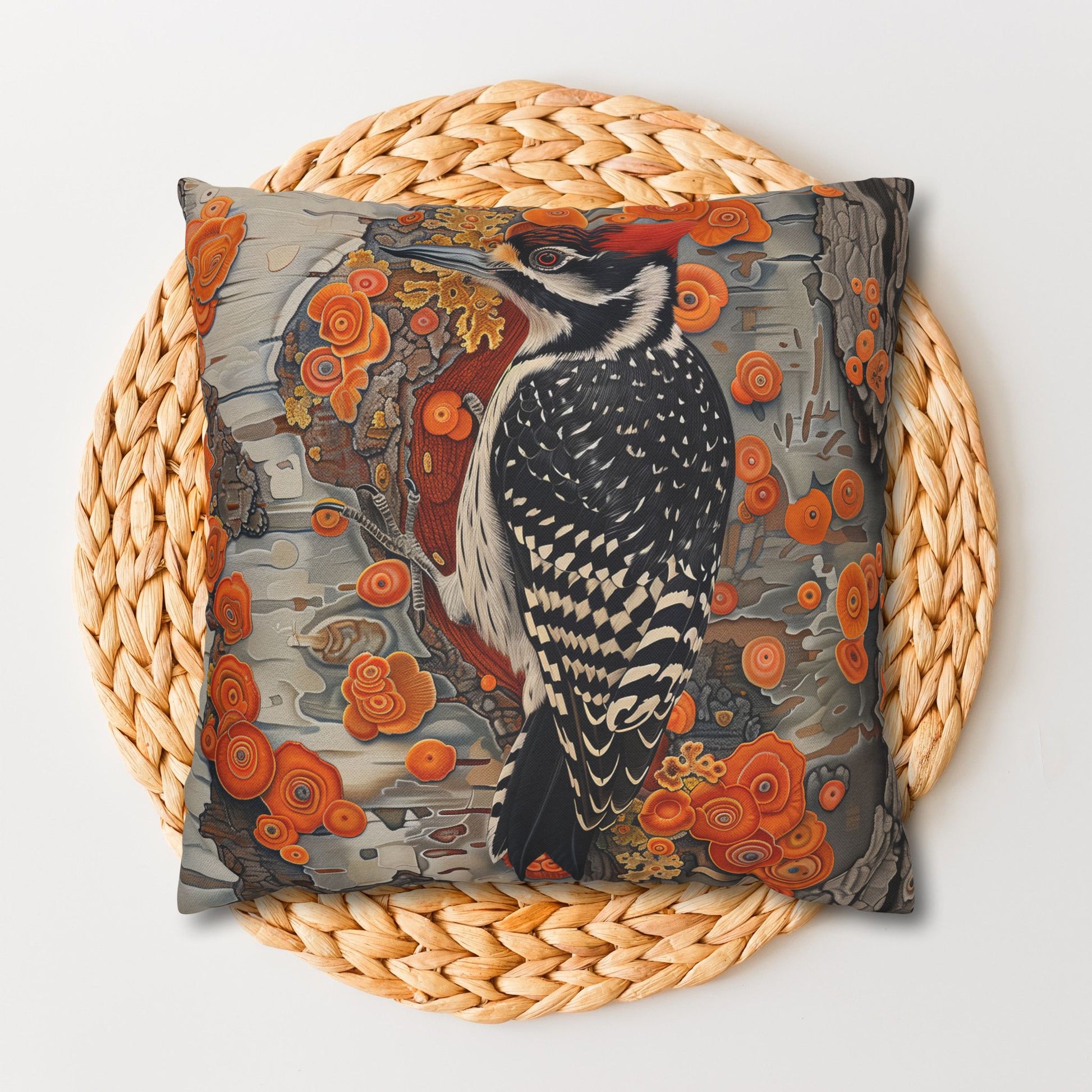 Bring the beauty of the forest into your home with this striking Woodpecker Pillow Cover. Featuring a highly detailed woodpecker perched on textured bark surrounded by vibrant orange lichen and foliage, this design perfectly captures the charm of woodland life. The intricate artwork and rich autumn tones make it an ideal addition to rustic cabins, cozy living rooms, or nature-inspired spaces. Perfect as a gift for bird watchers, nature lovers, or anyone who appreciates unique and artistic home decor. Elevate your space with this eye-catching and cozy woodland accent!