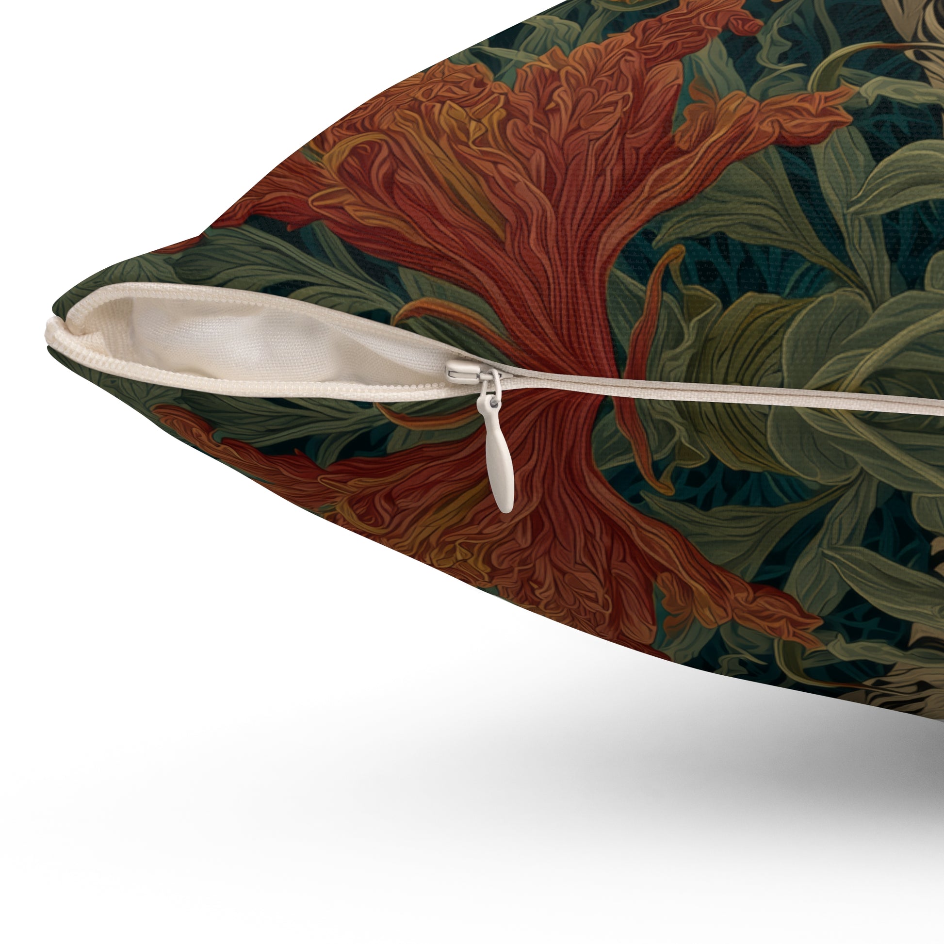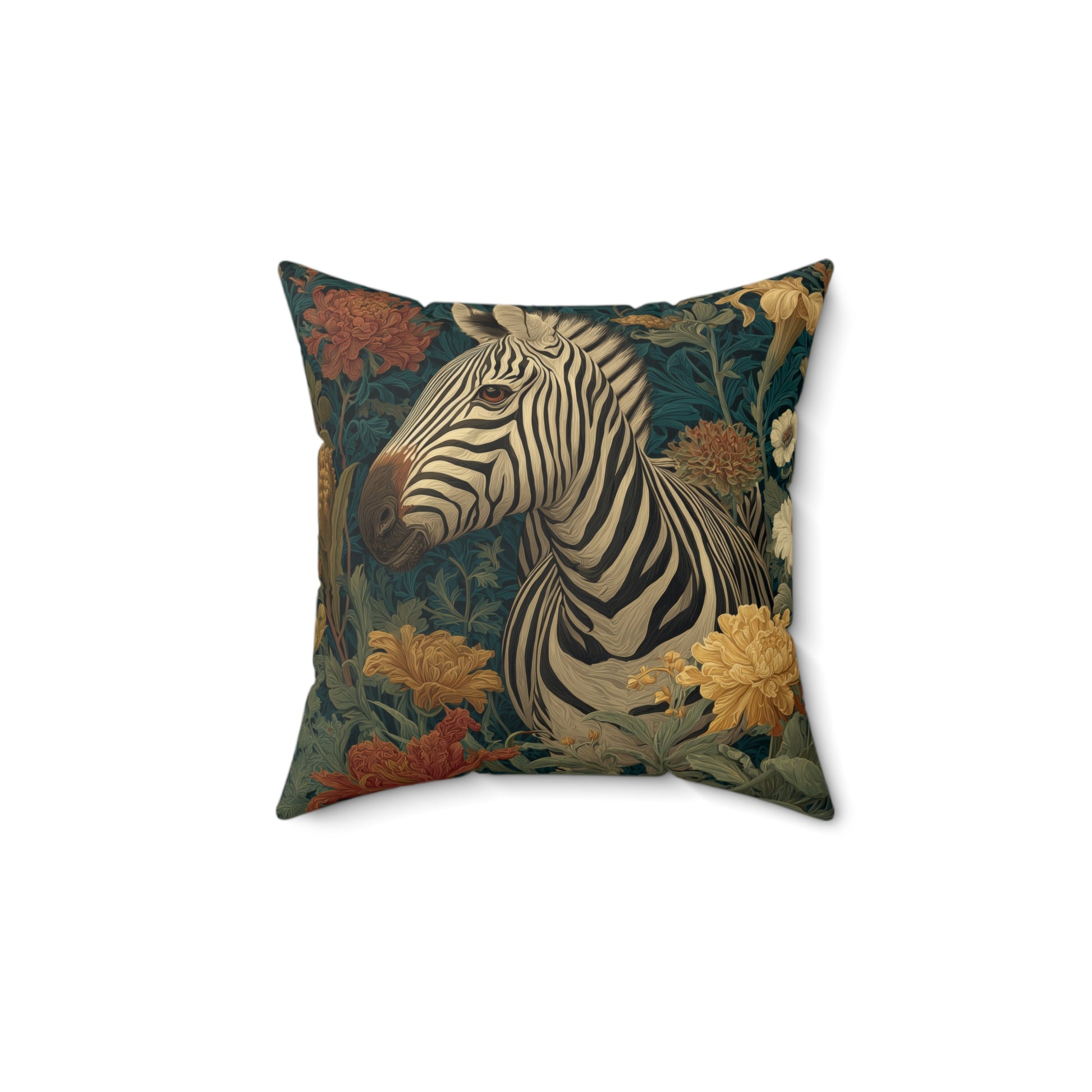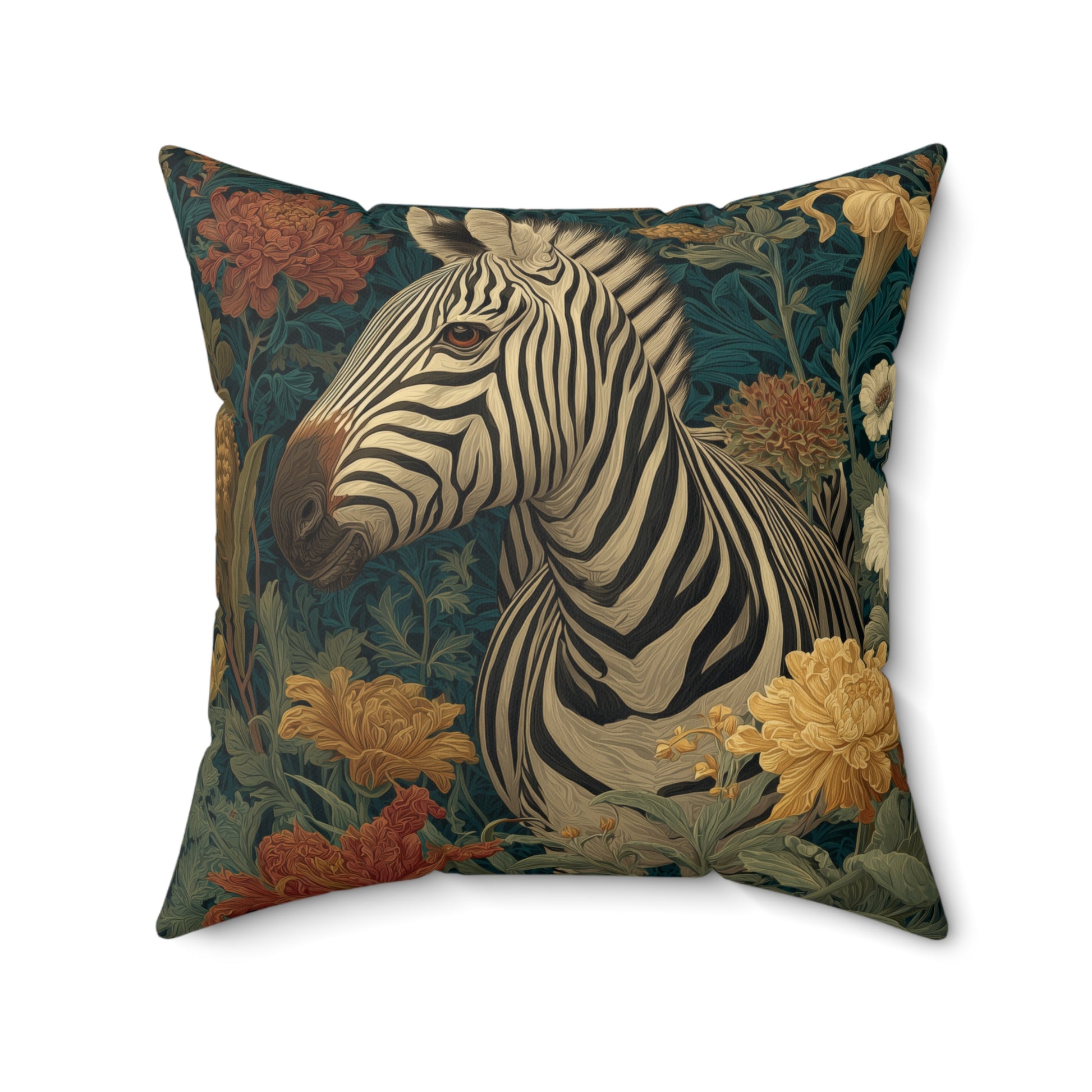 Bring refined safari charm into your home with this beautifully illustrated Zebra Floral Pillow, crafted in a lush William Morris–inspired botanical style. The zebra’s soft cream-and-charcoal stripes contrast elegantly against a garden of warm golds, leafy greens, deep teal tones, and vintage florals. Every detail—each petal, each curve of the zebra’s coat—feels rich, layered, and reminiscent of hand-drawn tapestry art.
